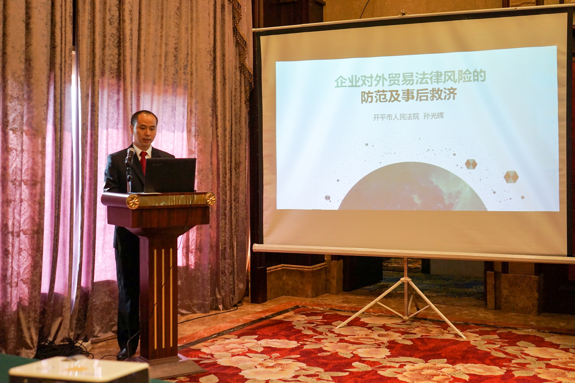 10月25日下午,开平市法学会举办第二期“以法兴企”文化沙龙活动。我院党组成员、副院长梁颖文以及民四庭法官孙光辉受邀参加本次活动。会上,孙法官代表我院围绕“新常态企业对外贸易问题及对策”的活动主题,结合实际案例进行了发言,并为企业家代表讲解企业在经营管理中的涉外法律注意事项,收到了良好的效果。