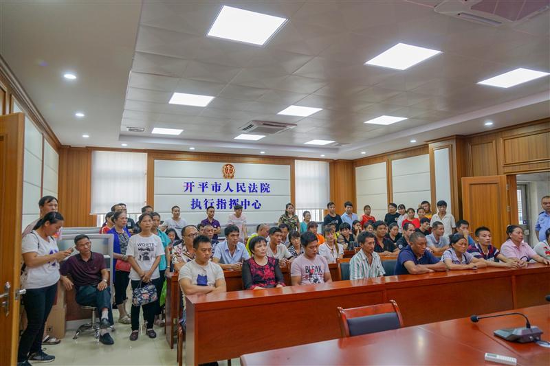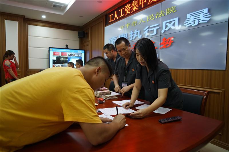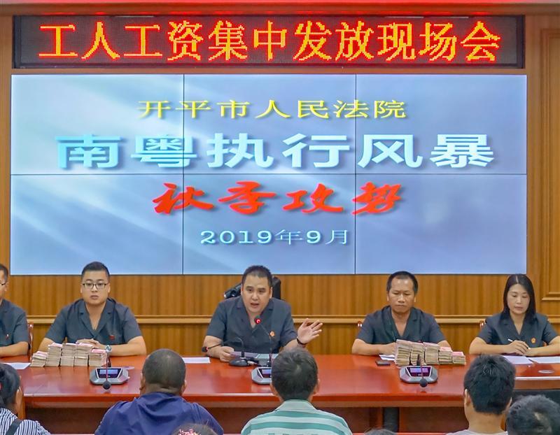 9月18日下午,我院在执行指挥中心举行工人工资发放现场会,115名工人被拖欠数月高达110万元的工资终于全部执结,工人们的脸上露出喜悦的笑容,并对法官及执行工作人员表示衷心感谢。在这宗欠薪案中,被执行人是开平市恒昊木业有限公司。自今年6月起,该公司因经营不善一直拖欠工人工资。随后,115名工人向开平市劳动人事争议仲裁委员会申请仲裁,双方约定8月12日前支付,但公司迟迟不履行。8月14日,工人向我院申请强制执行。我院立即启动涉民生案件执行立案绿色通道,立案庭一天内顺利完成115个案件的立案登记,并全部移交执行局处置。
