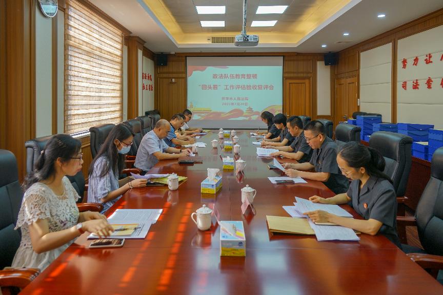 7月26日,开平市委政法委常务副书记郑国荣率市政法队伍教育整顿工作领导小组复评工作组一行6人到我院开展政法队伍教育整顿“回头看”评估验收复评工作,并召开评估验收复评会。会议由开平市委政法委副书记杨飘主持,我院党组书记、院长曹富荣及我院教育整顿领导小组办公室部分成员参加了会议。