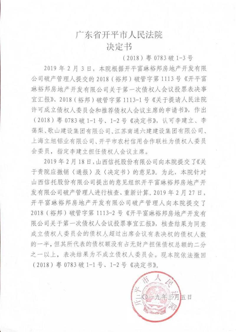 广东省开平市人民法院关于撤回开平富琳裕邦房地产开发有限公司破产重整一案相关文书的决定书