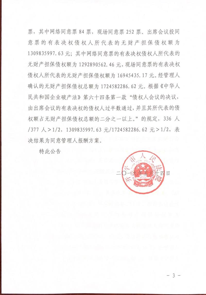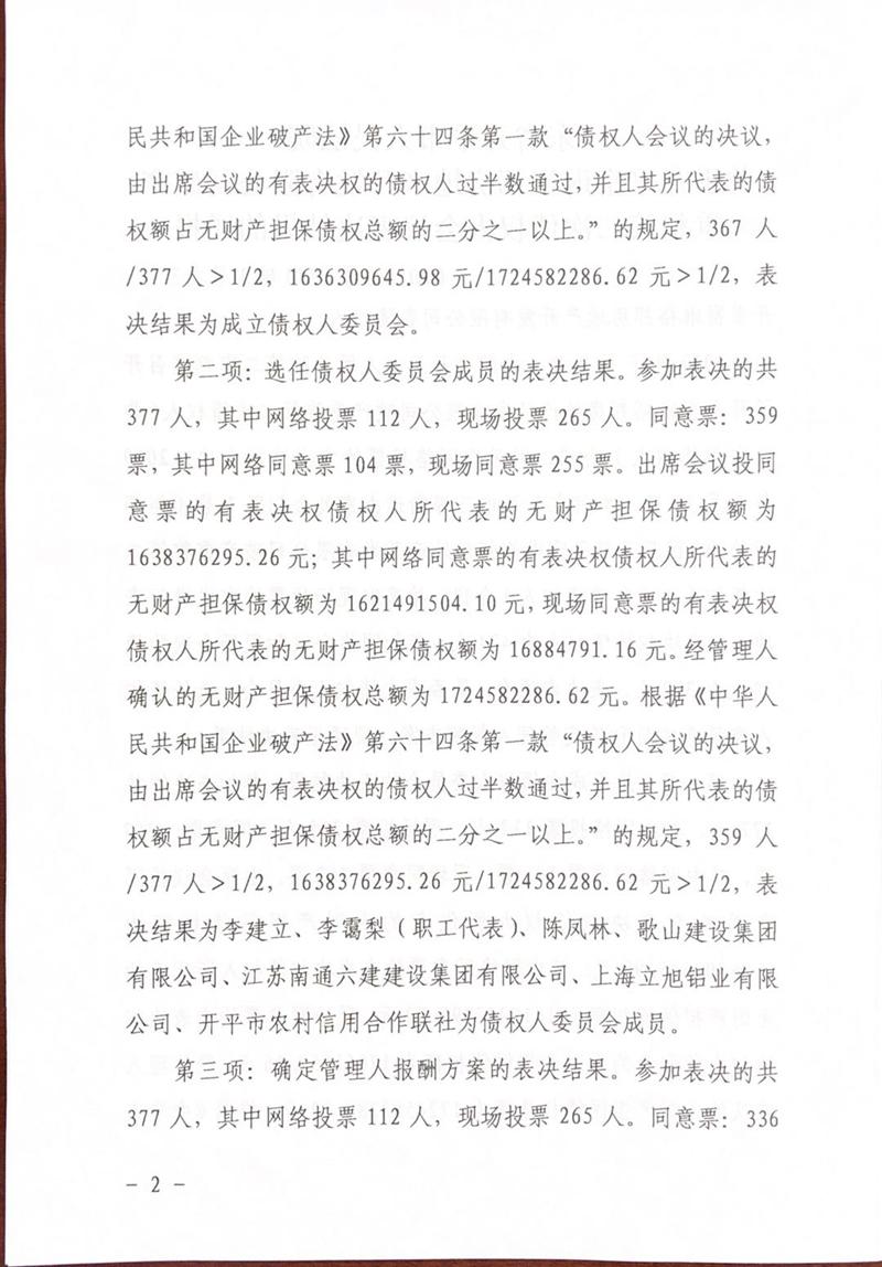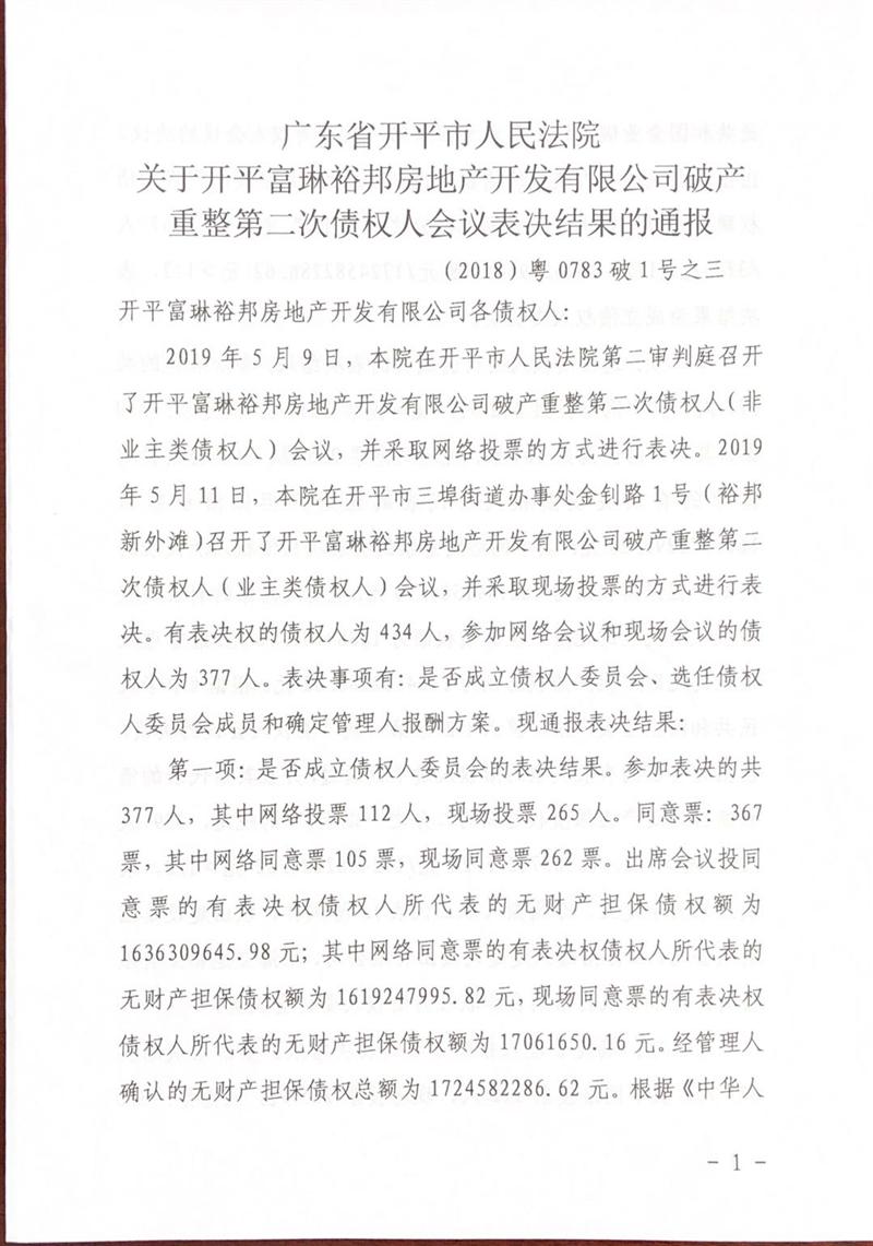 关于开平富琳裕邦房地产开发有限公司破产重整第二次债权人会议表决结果的通报