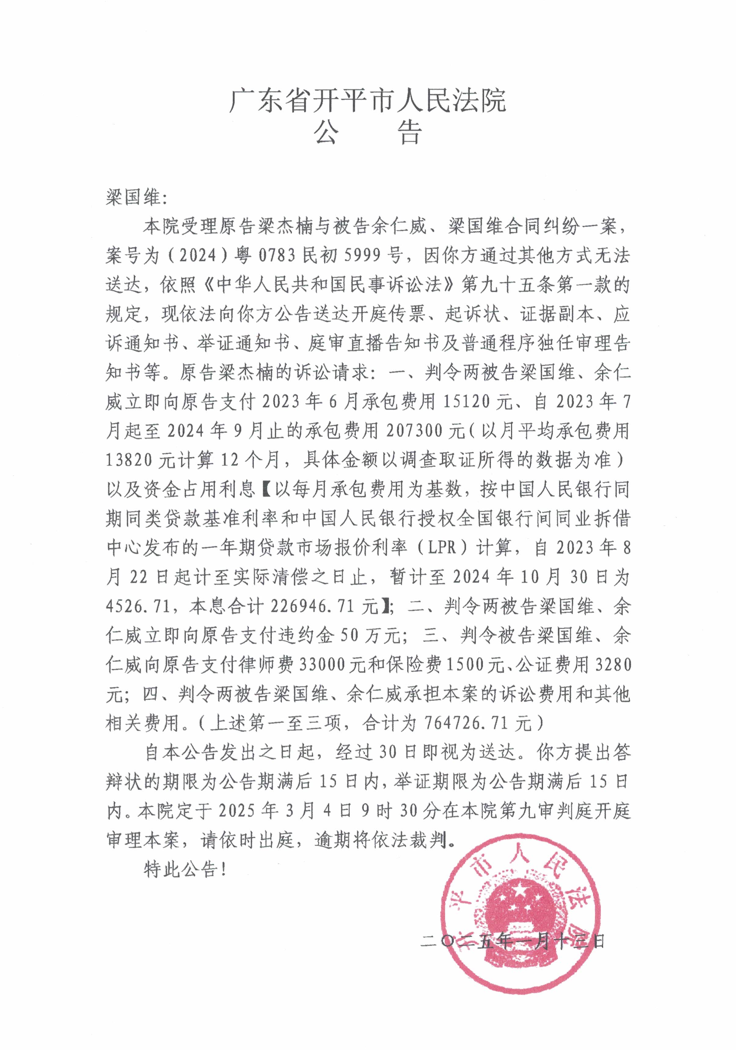 (2024)粤0783民初5999号 梁国维 开庭公告