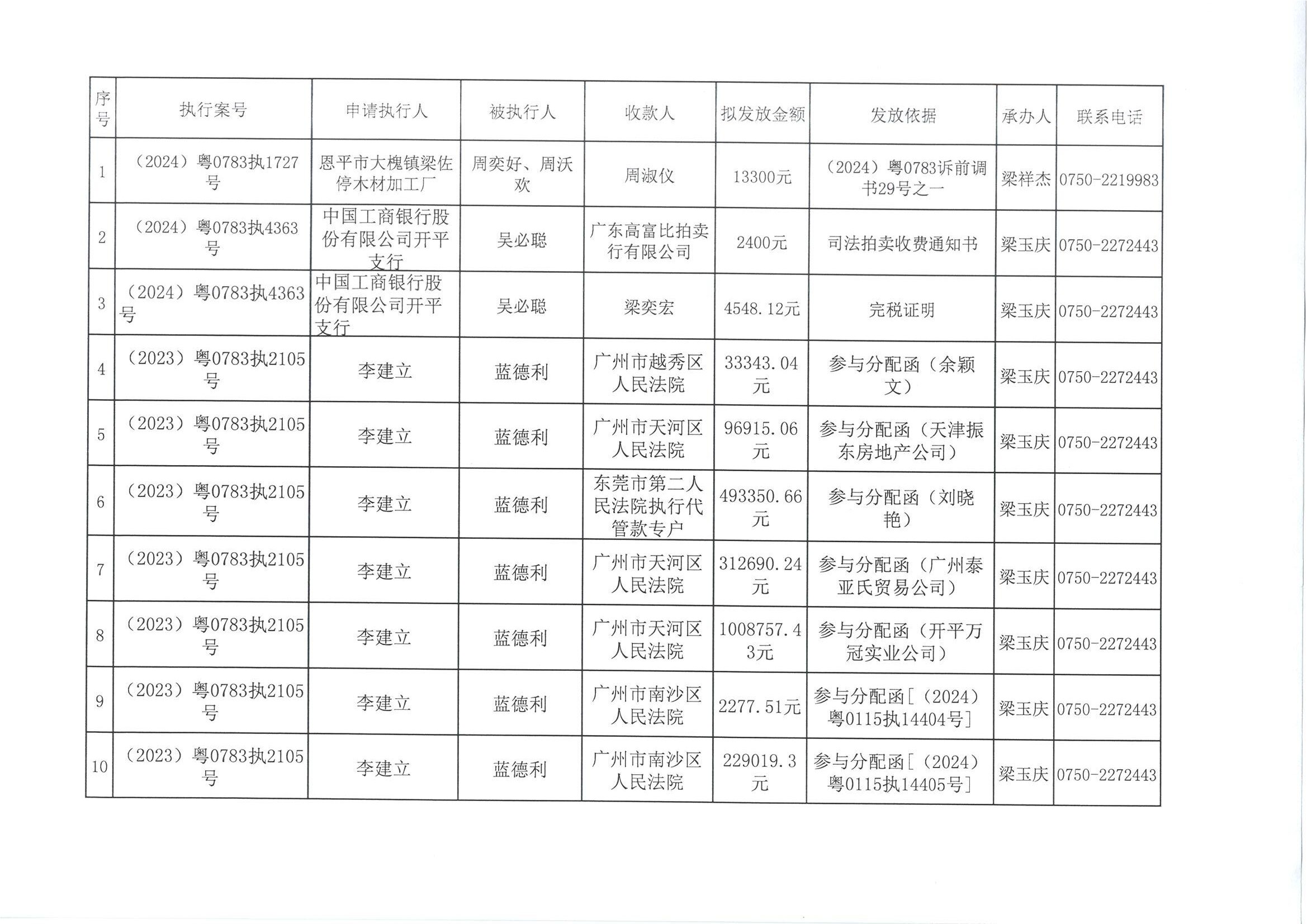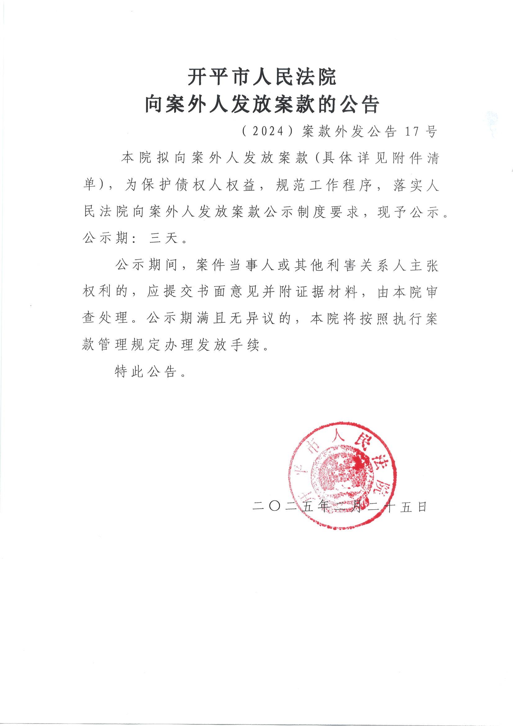(2025)案款外发公告17号向案外人发放案款的公告