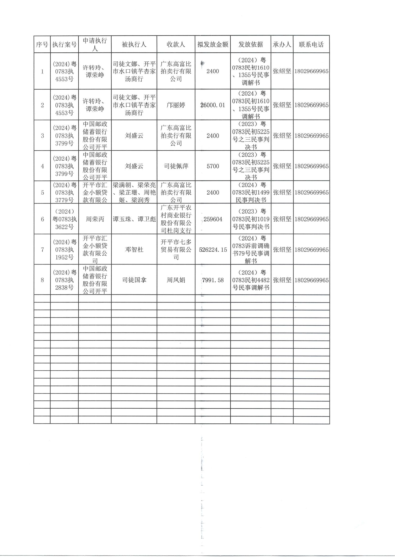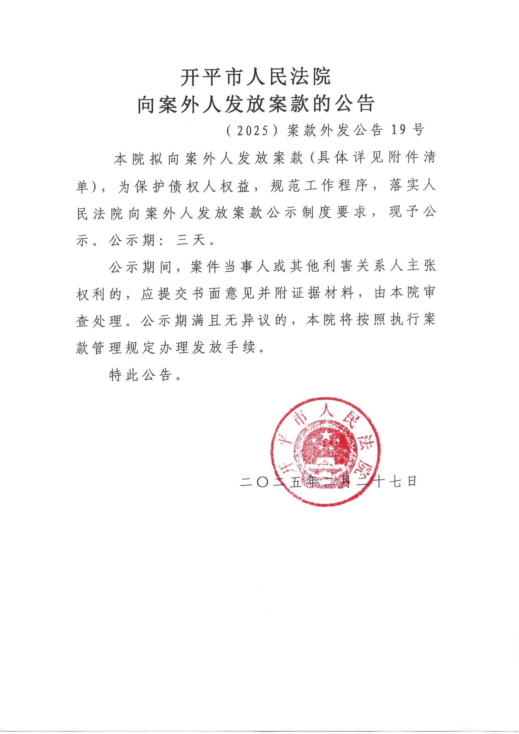 (2025)案款外发公告19号向案外人发放案款的公告