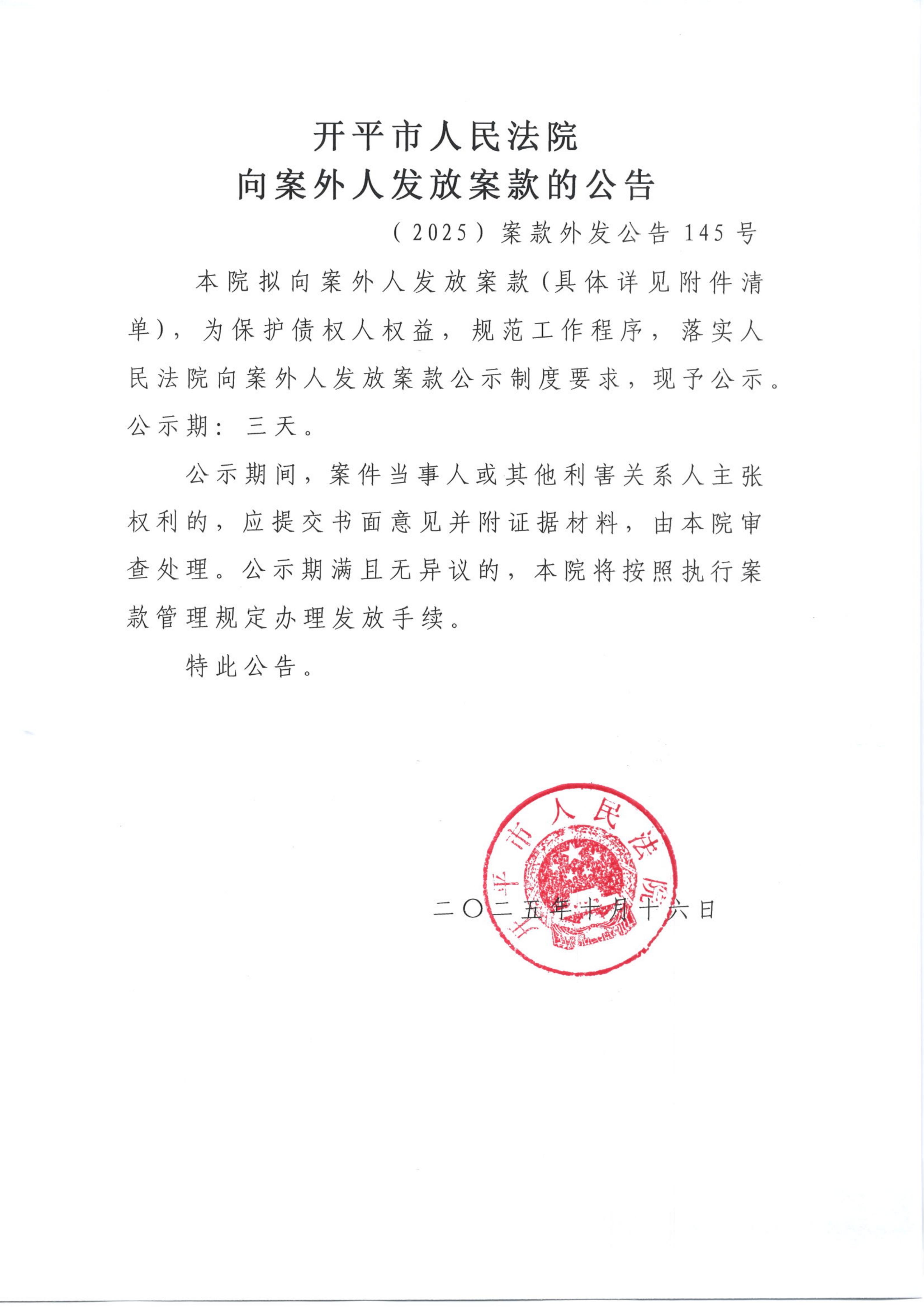 (2025)案款外发公告145号向案外人发放案款的公告