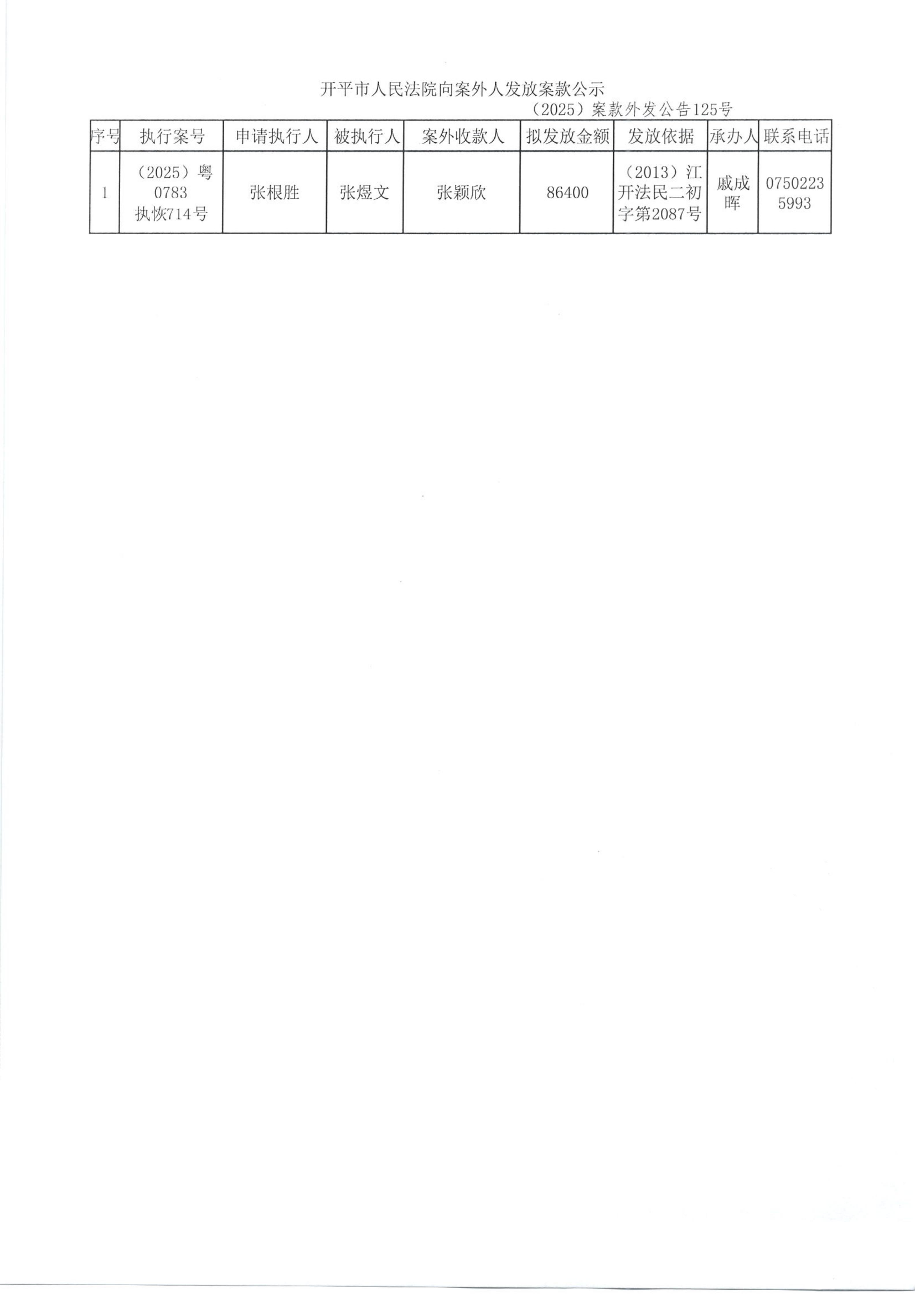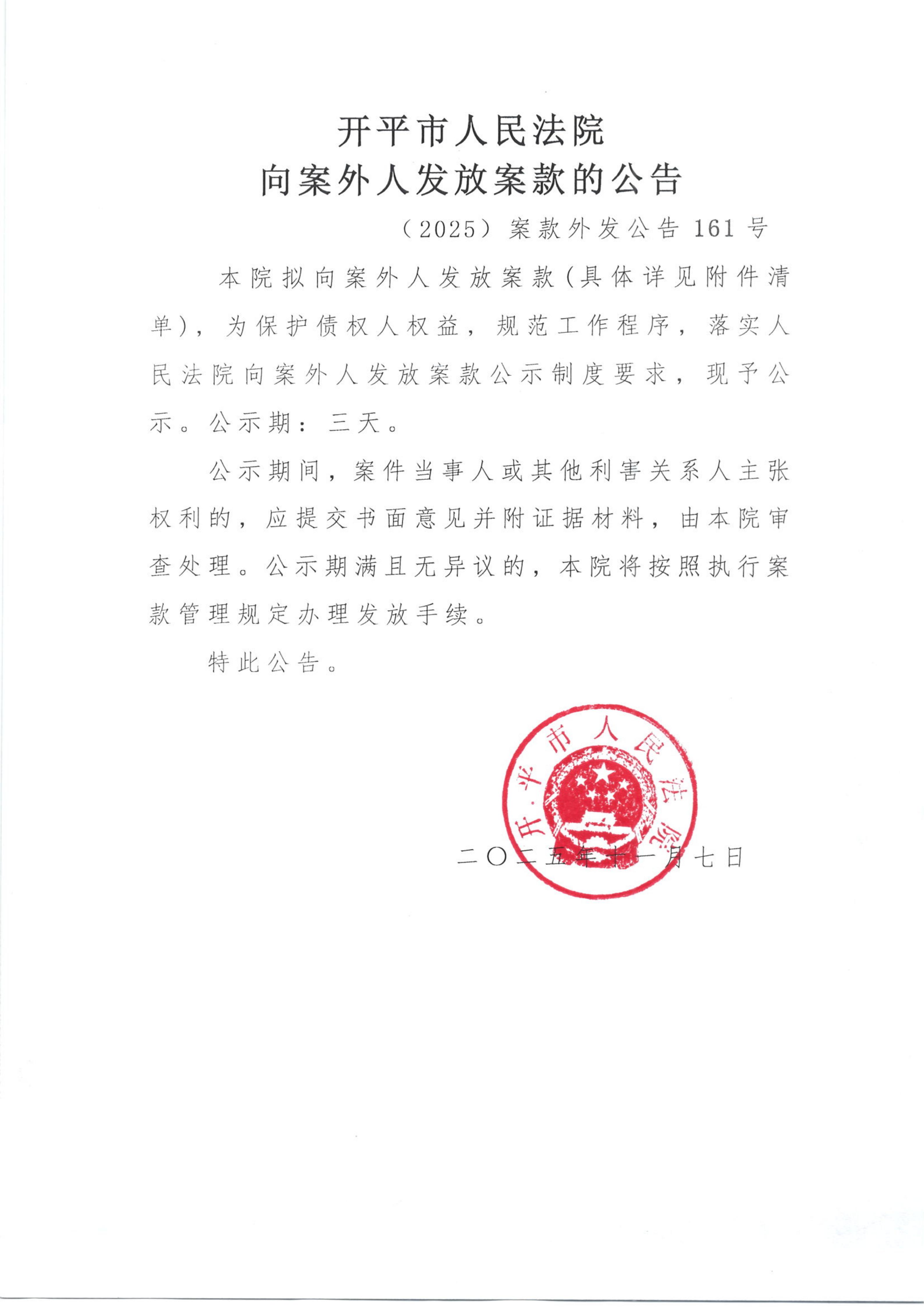 (2025)案款外发公告161号向案外人发放案款的公告