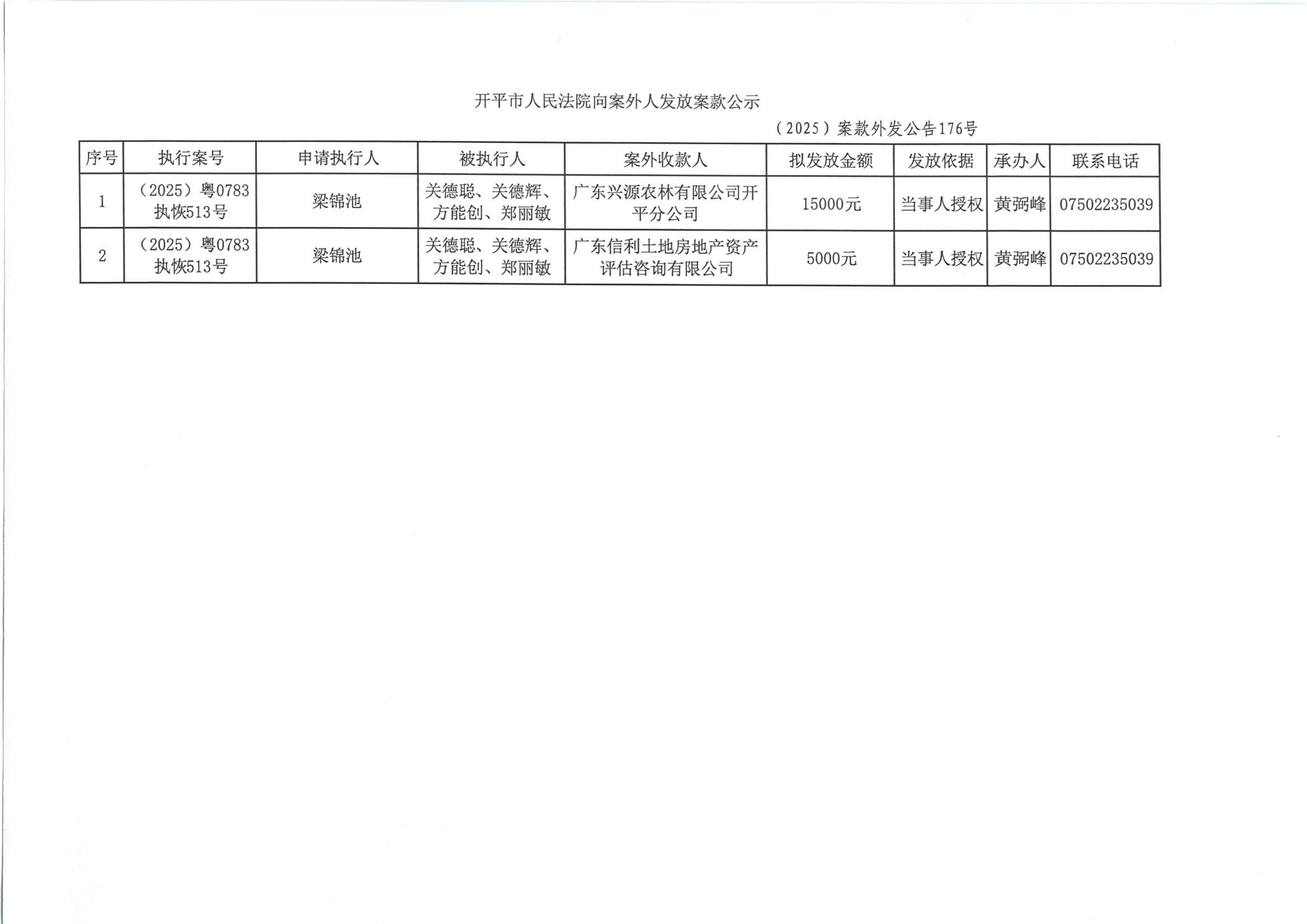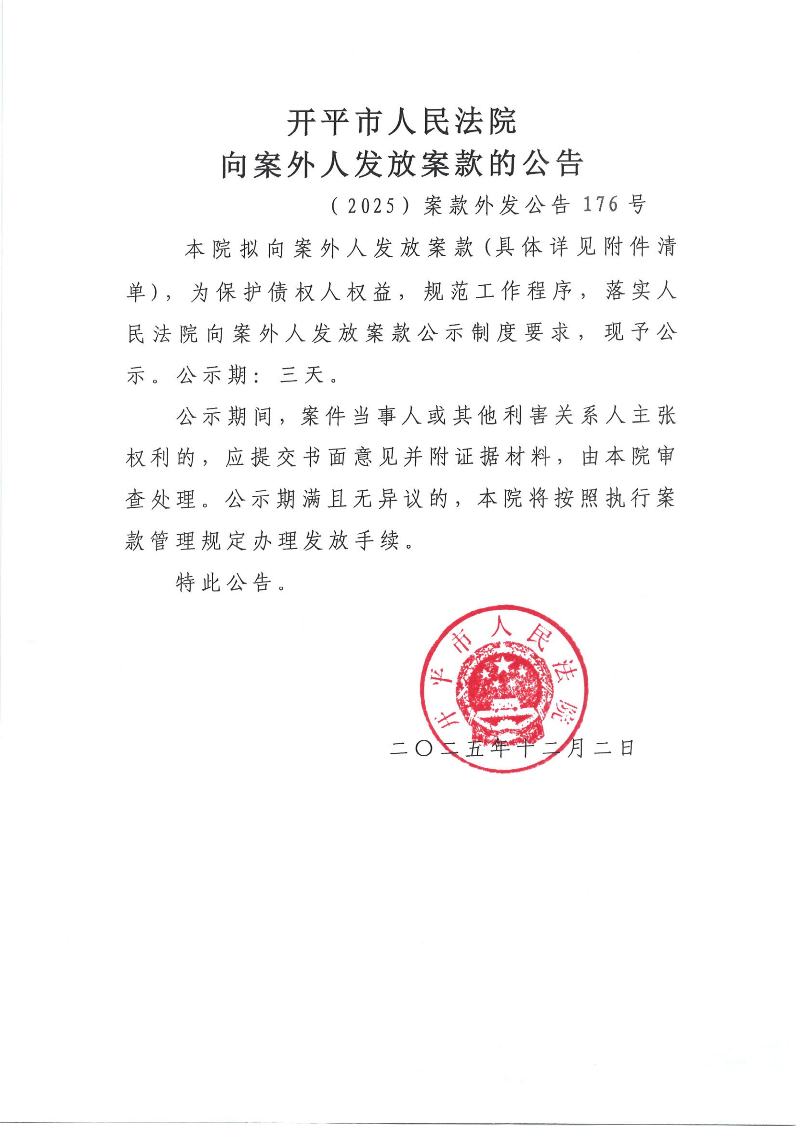 (2025)案款外发公告176号向案外人发放案款的公告