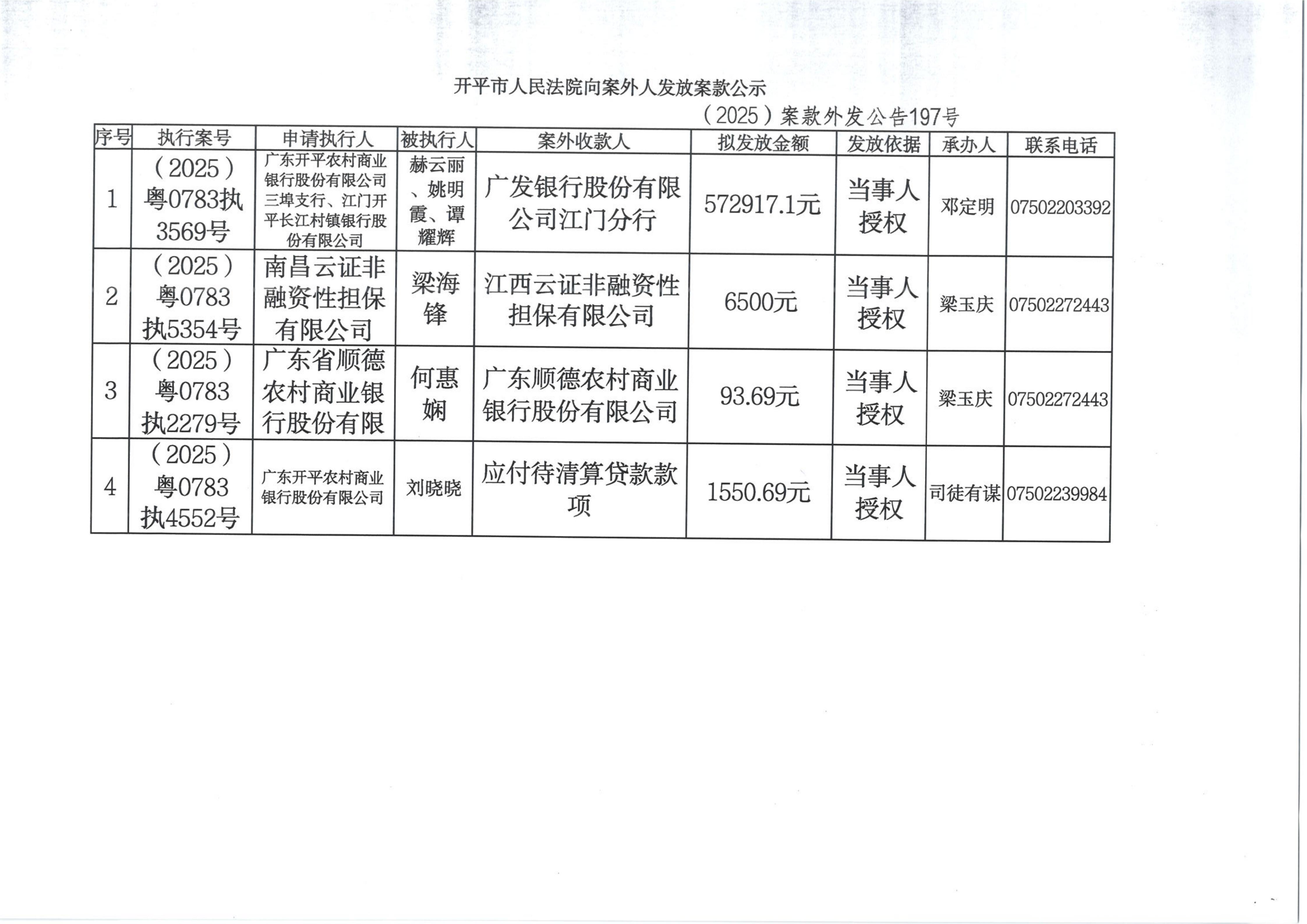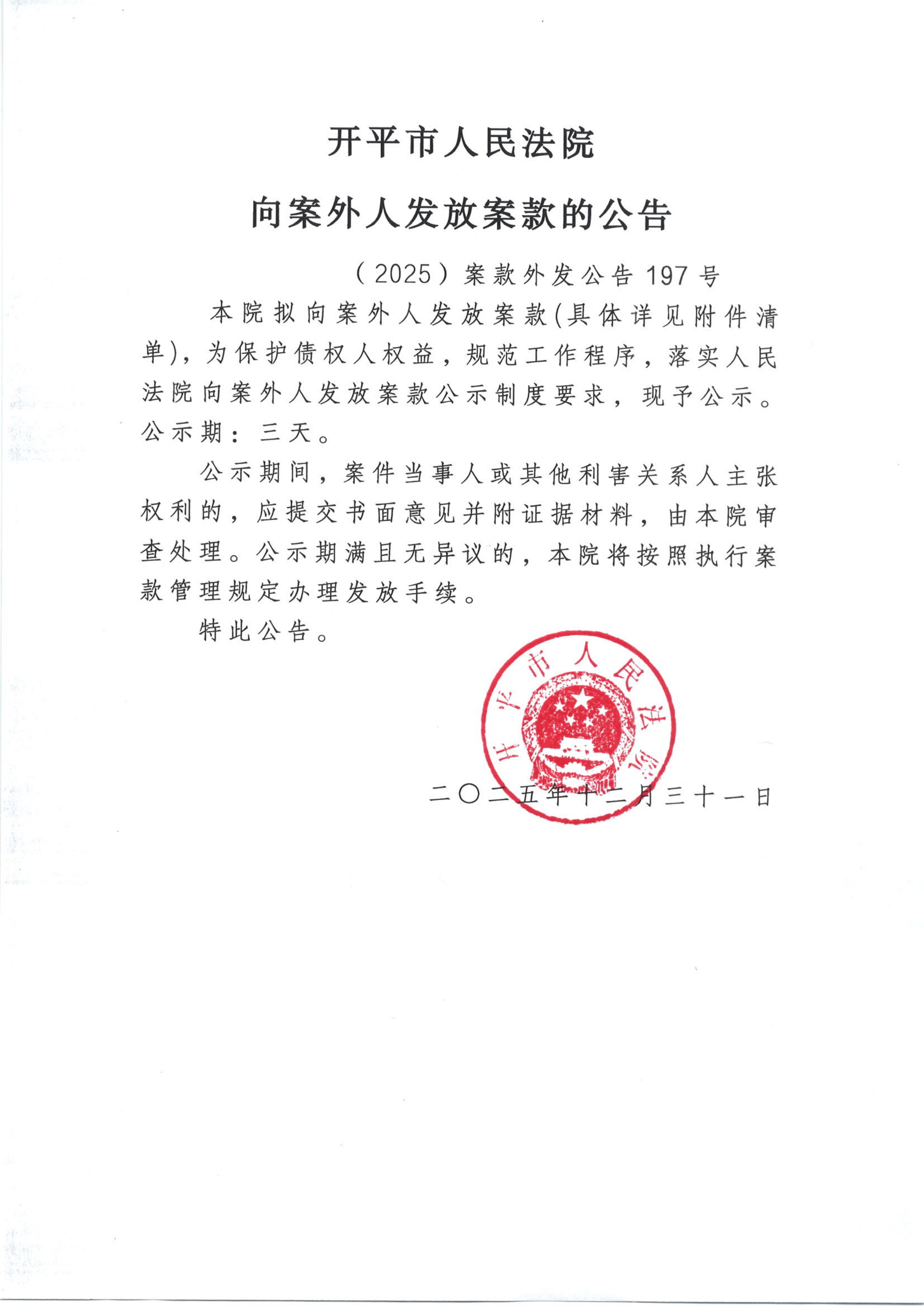 (2025)案款外发公告197号向案外人发放案款的公告