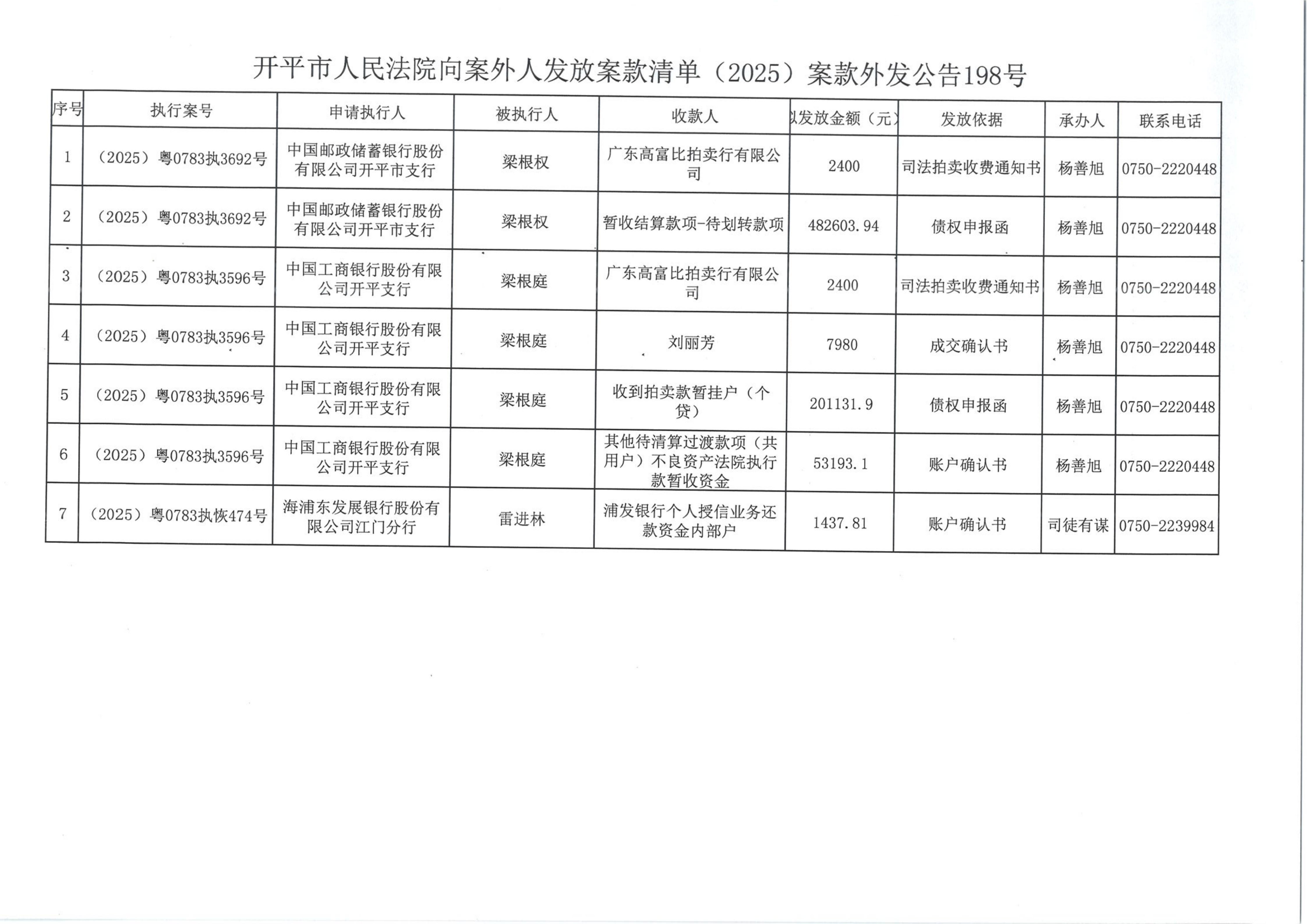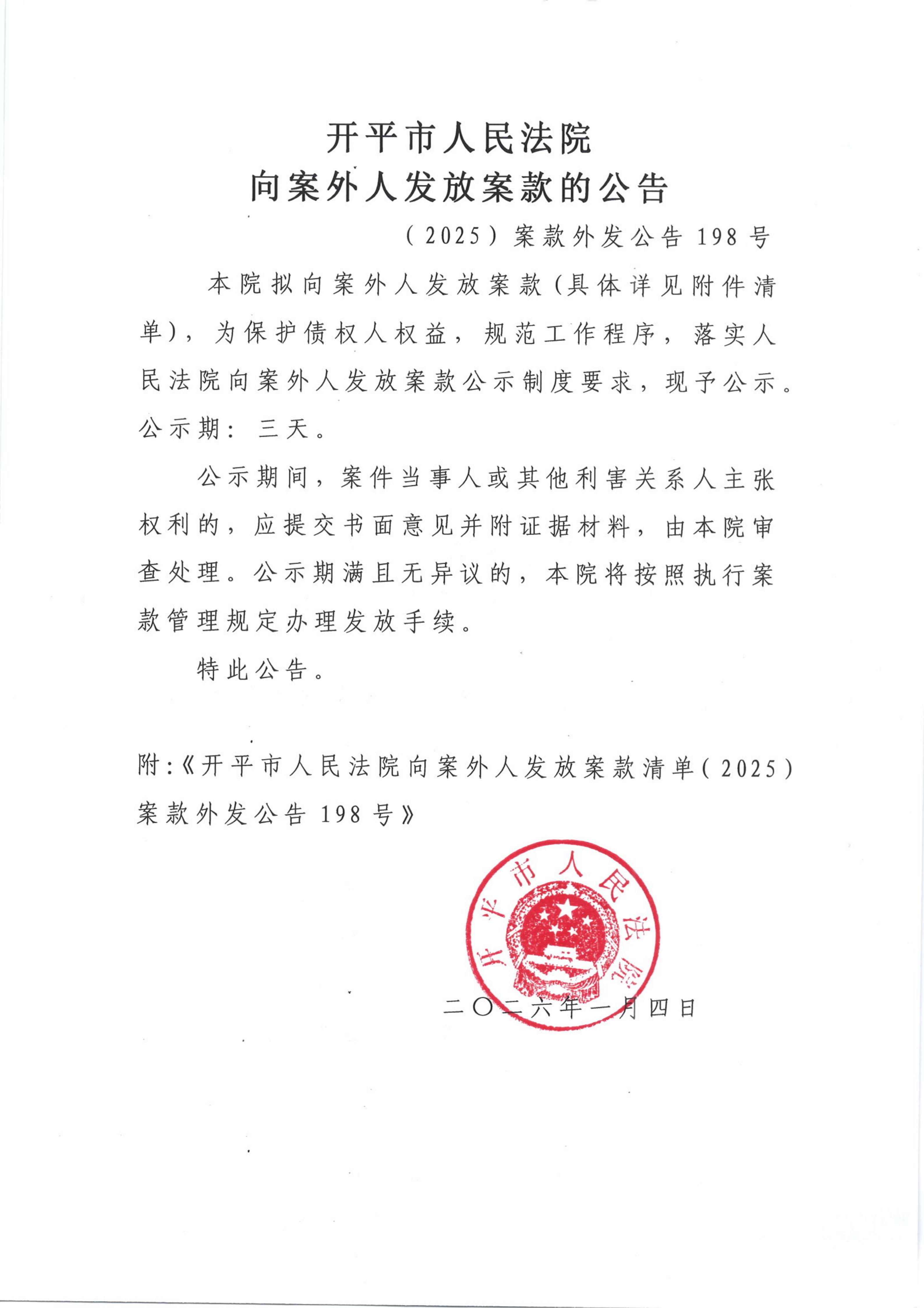 (2025)案款外发公告198号向案外人发放案款的公告