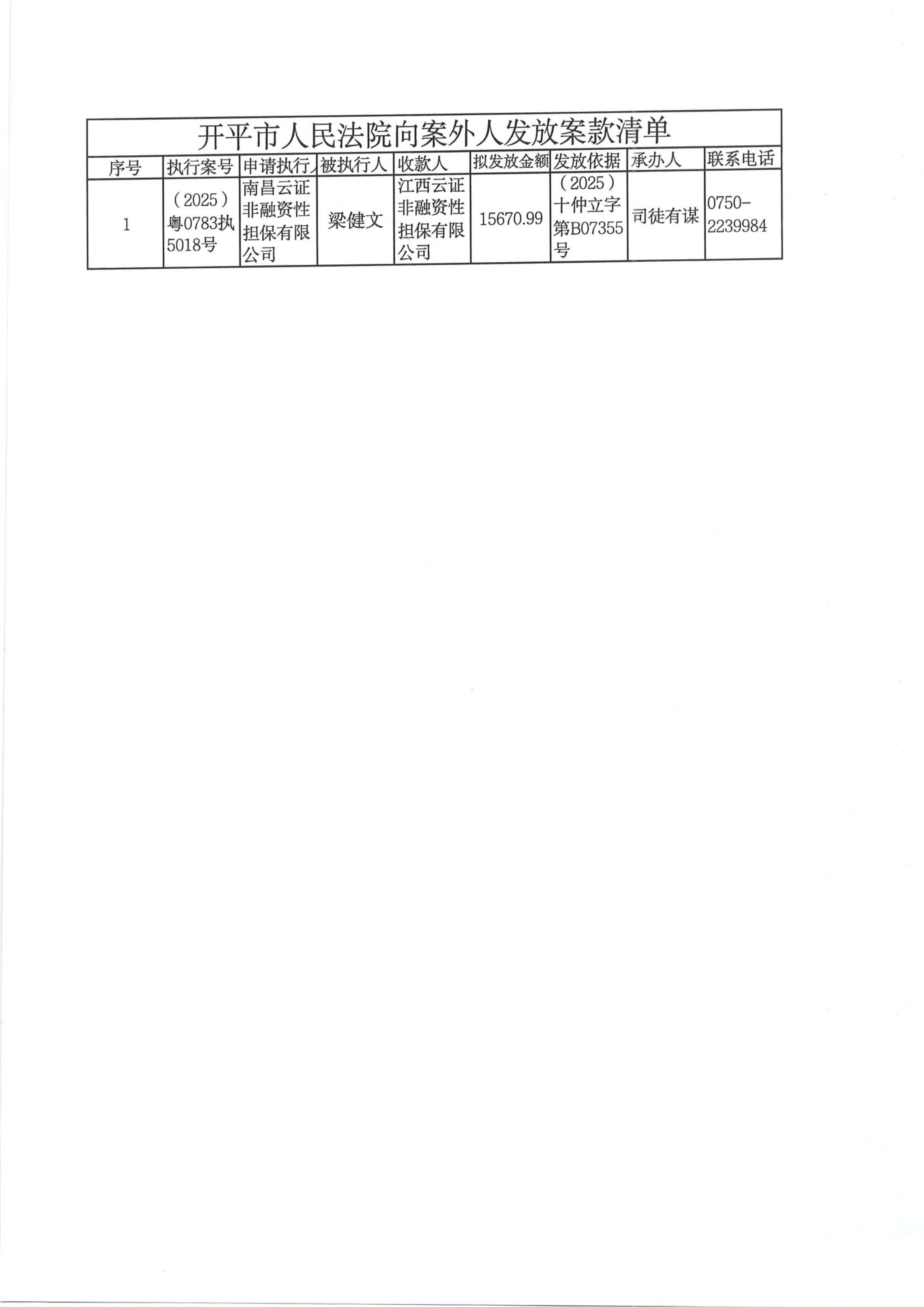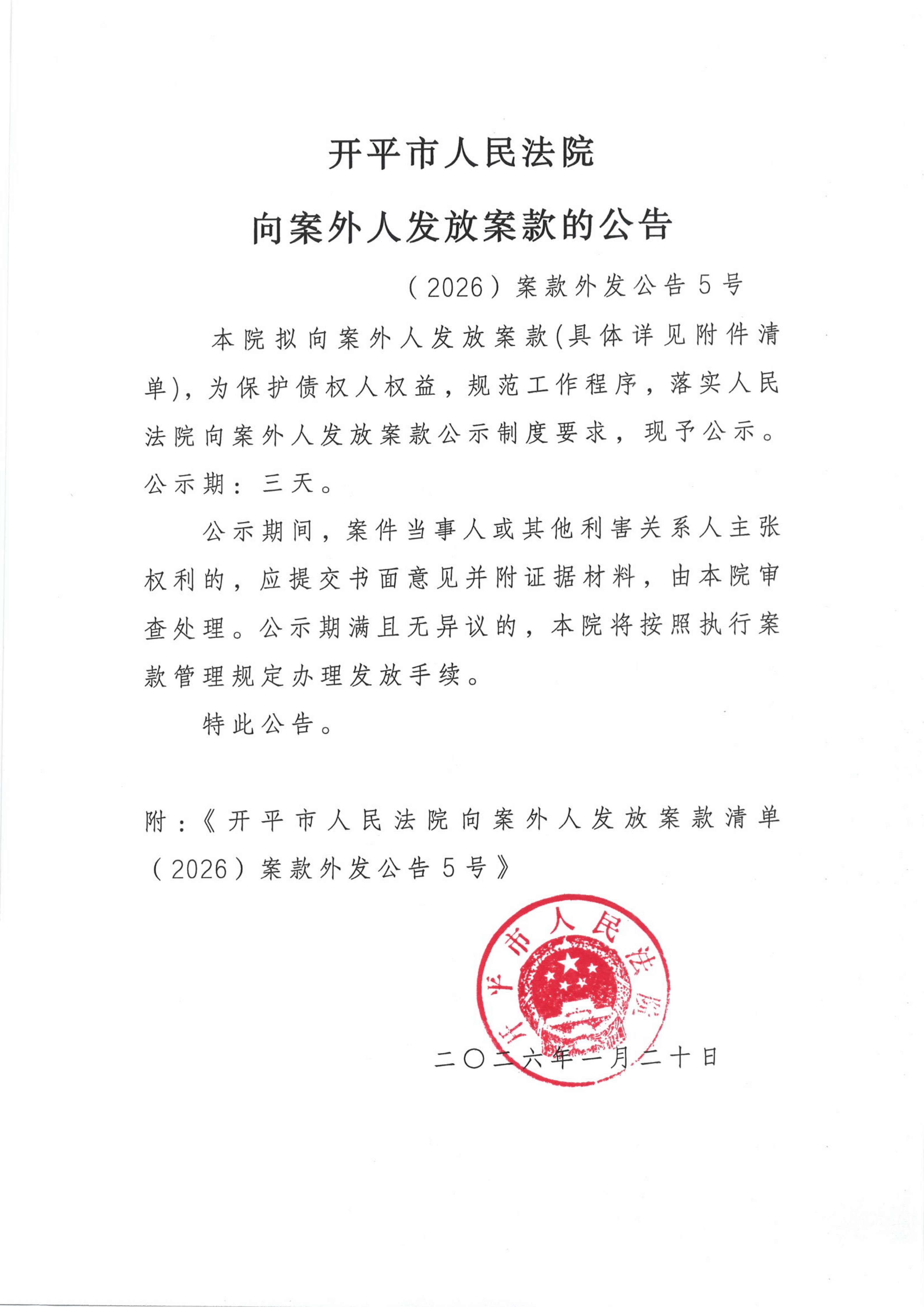 (2026)案款外发公告5号向案外人发放案款的公告