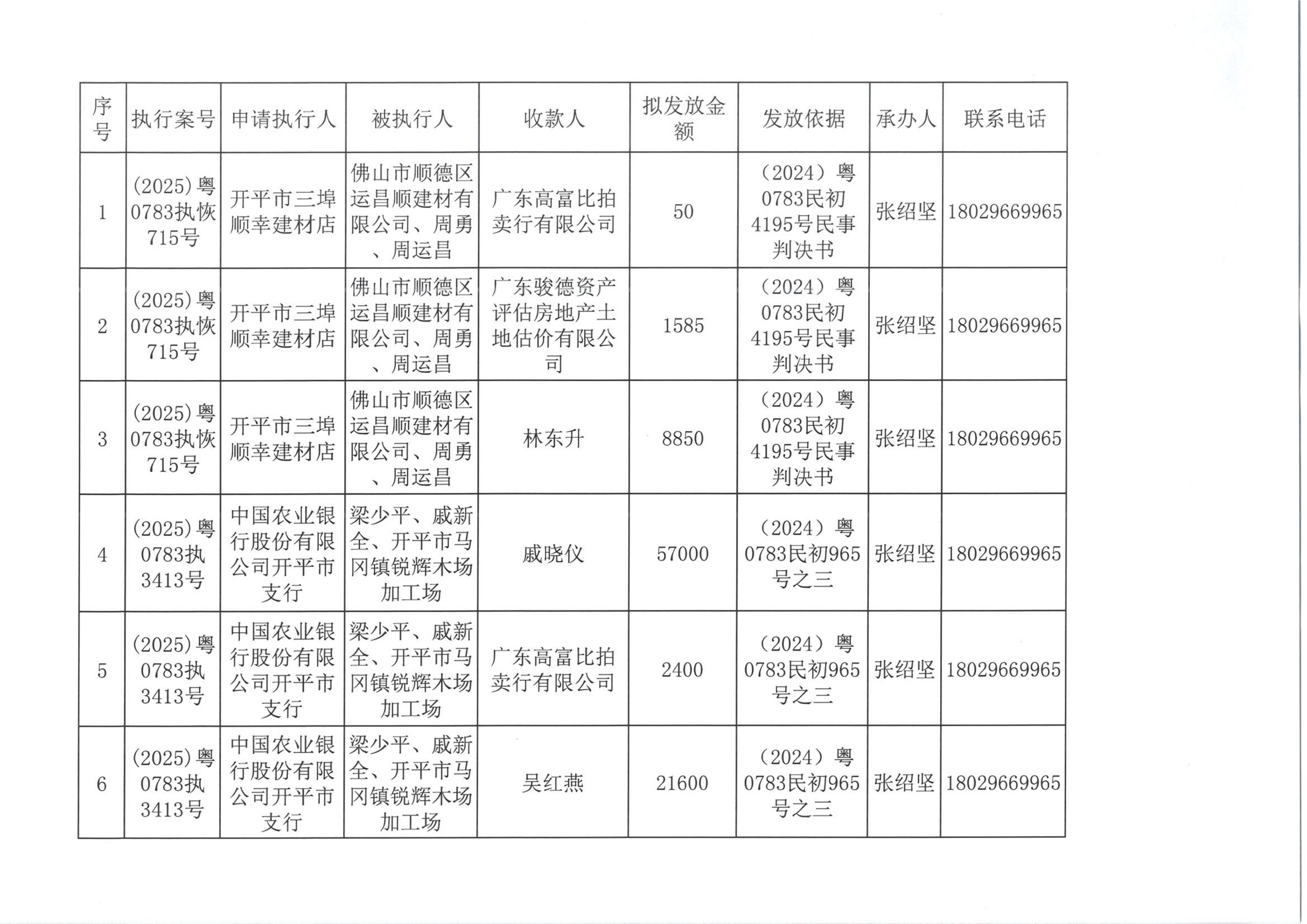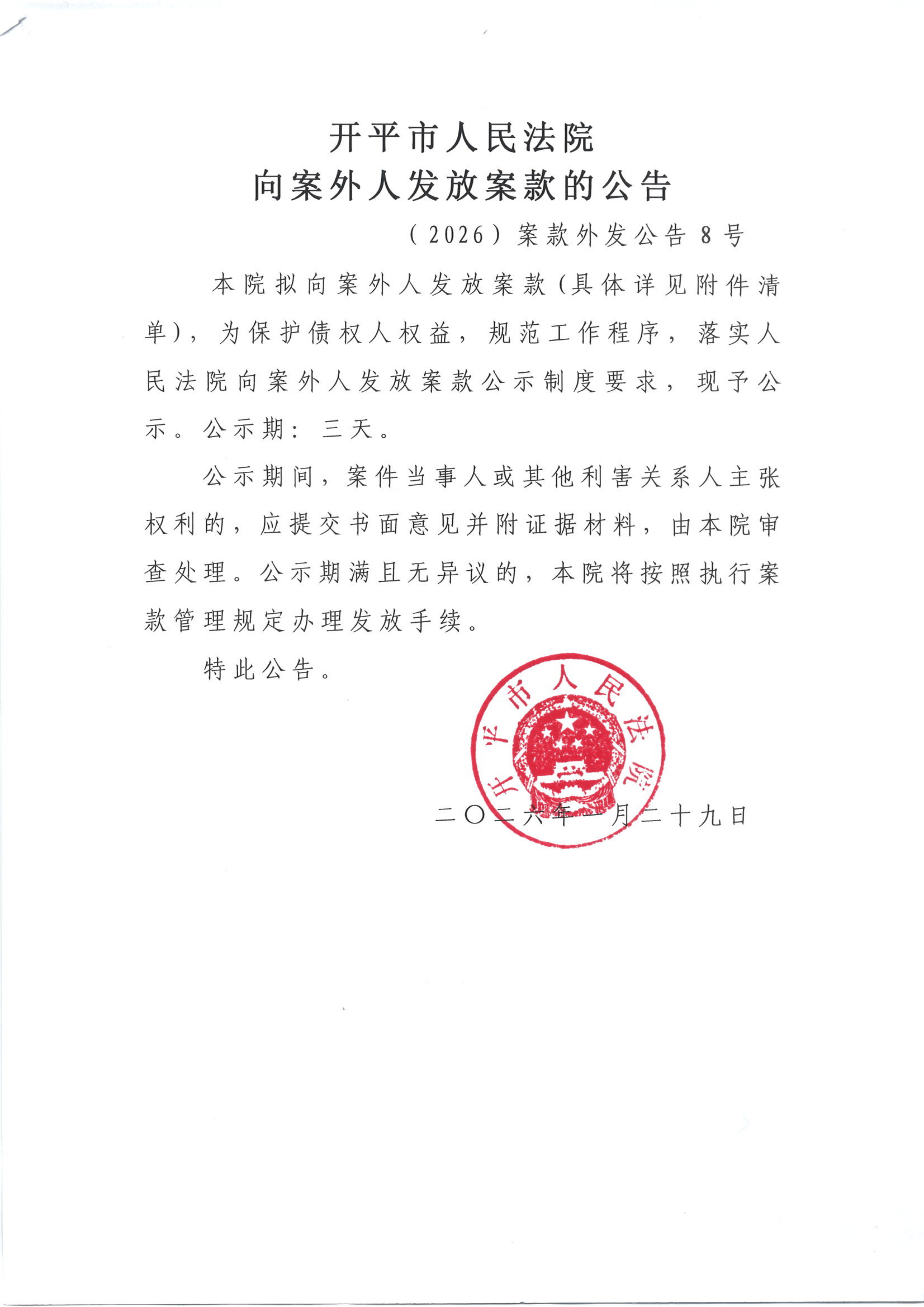 (2026)案款外发公告8号向案外人发放案款的公告