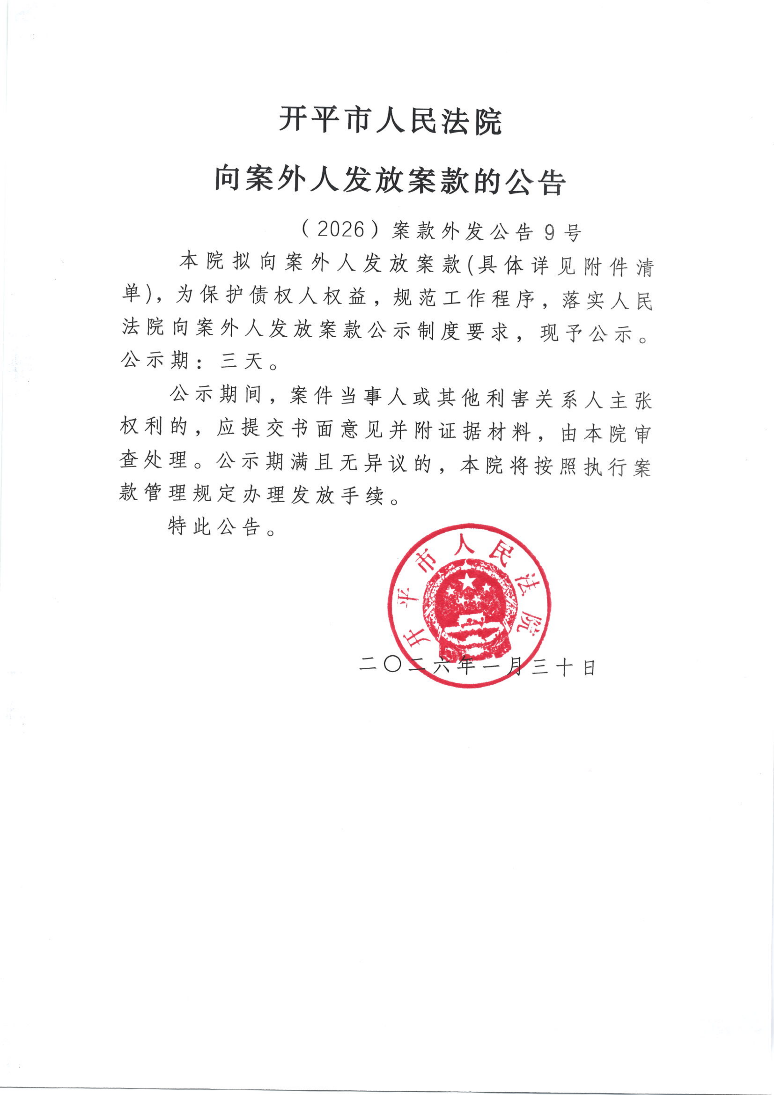 (2026)案款外发公告9号向案外人发放案款的公告