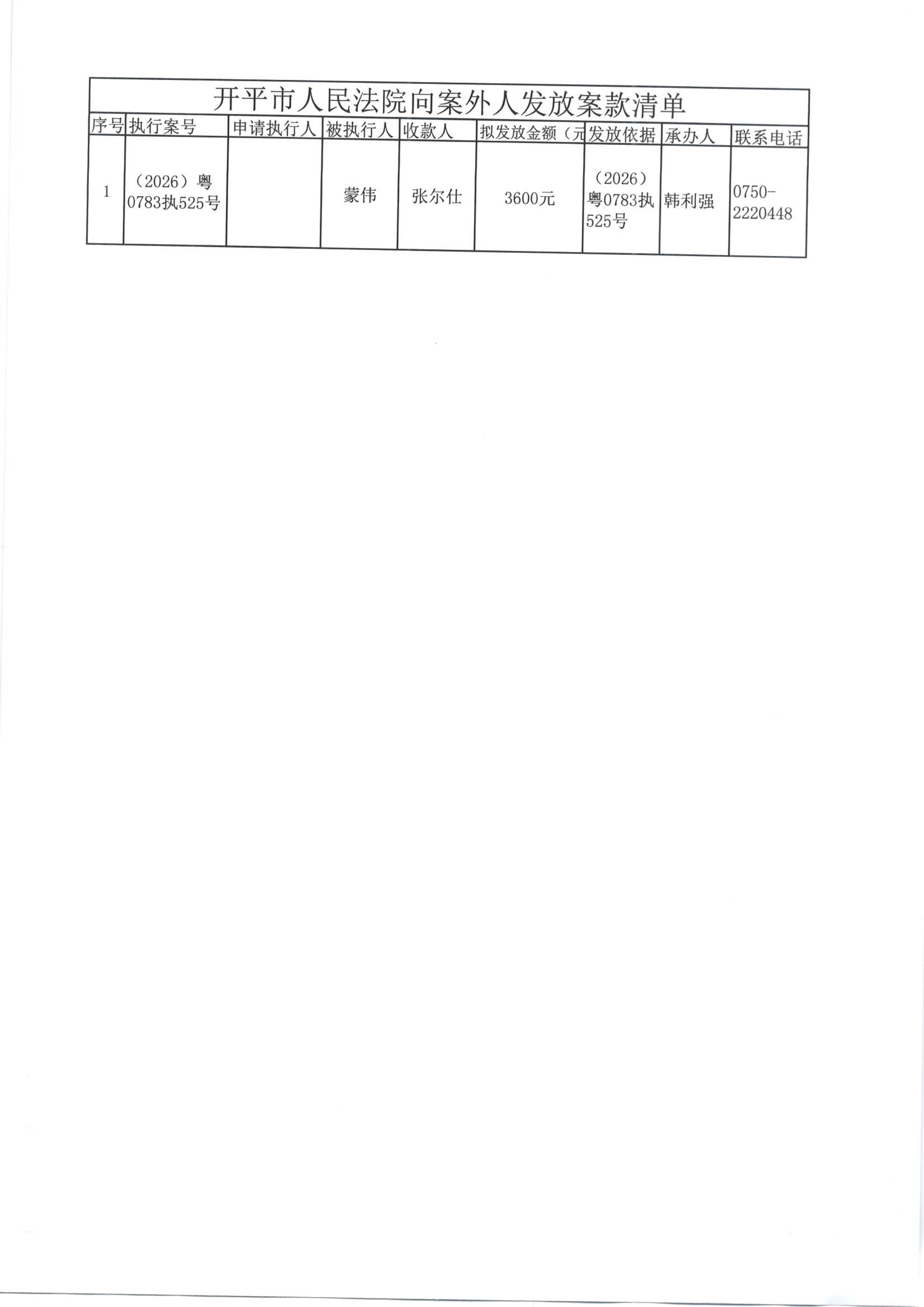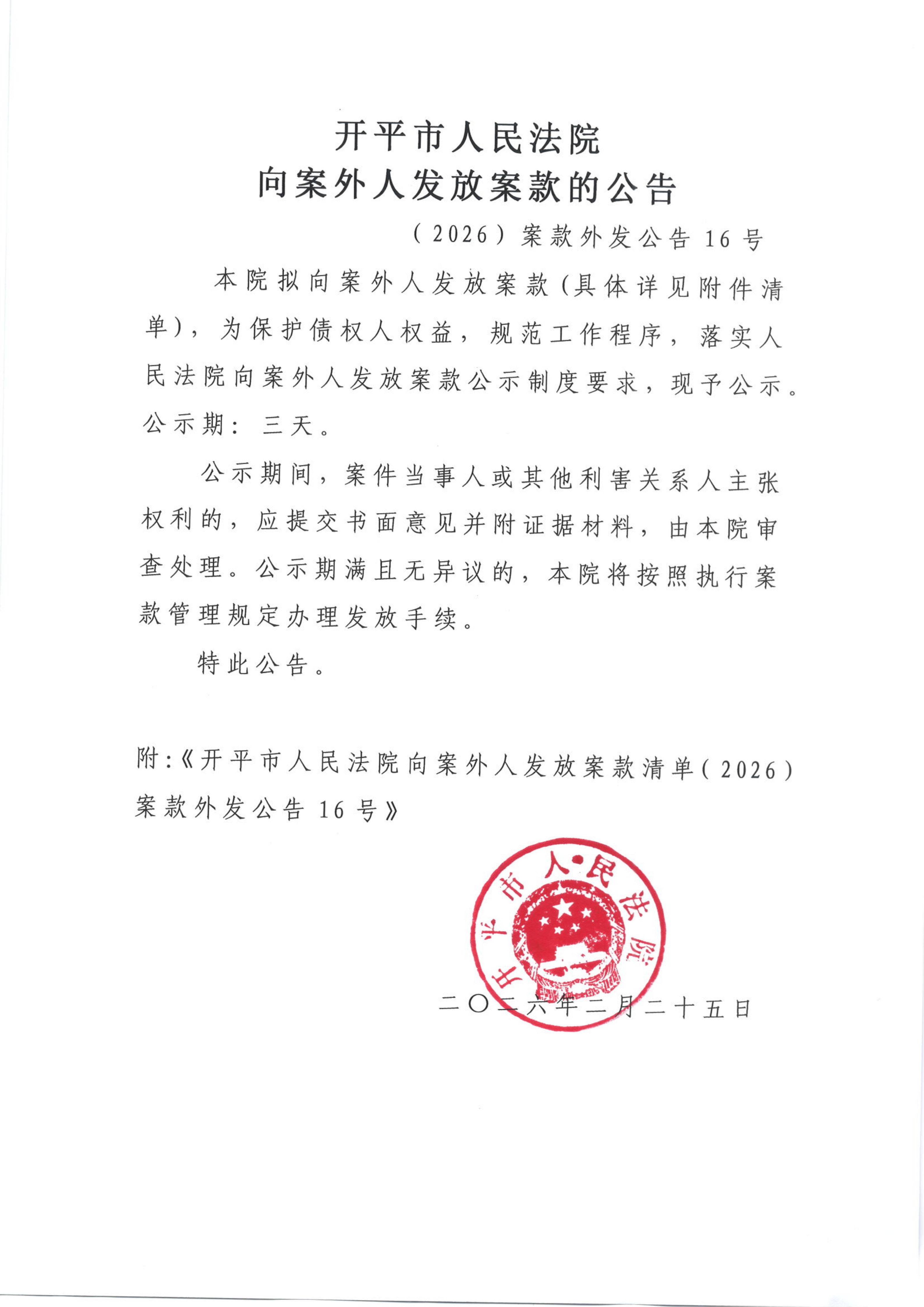 (2026)案款外发公告16号向案外人发放案款的公告