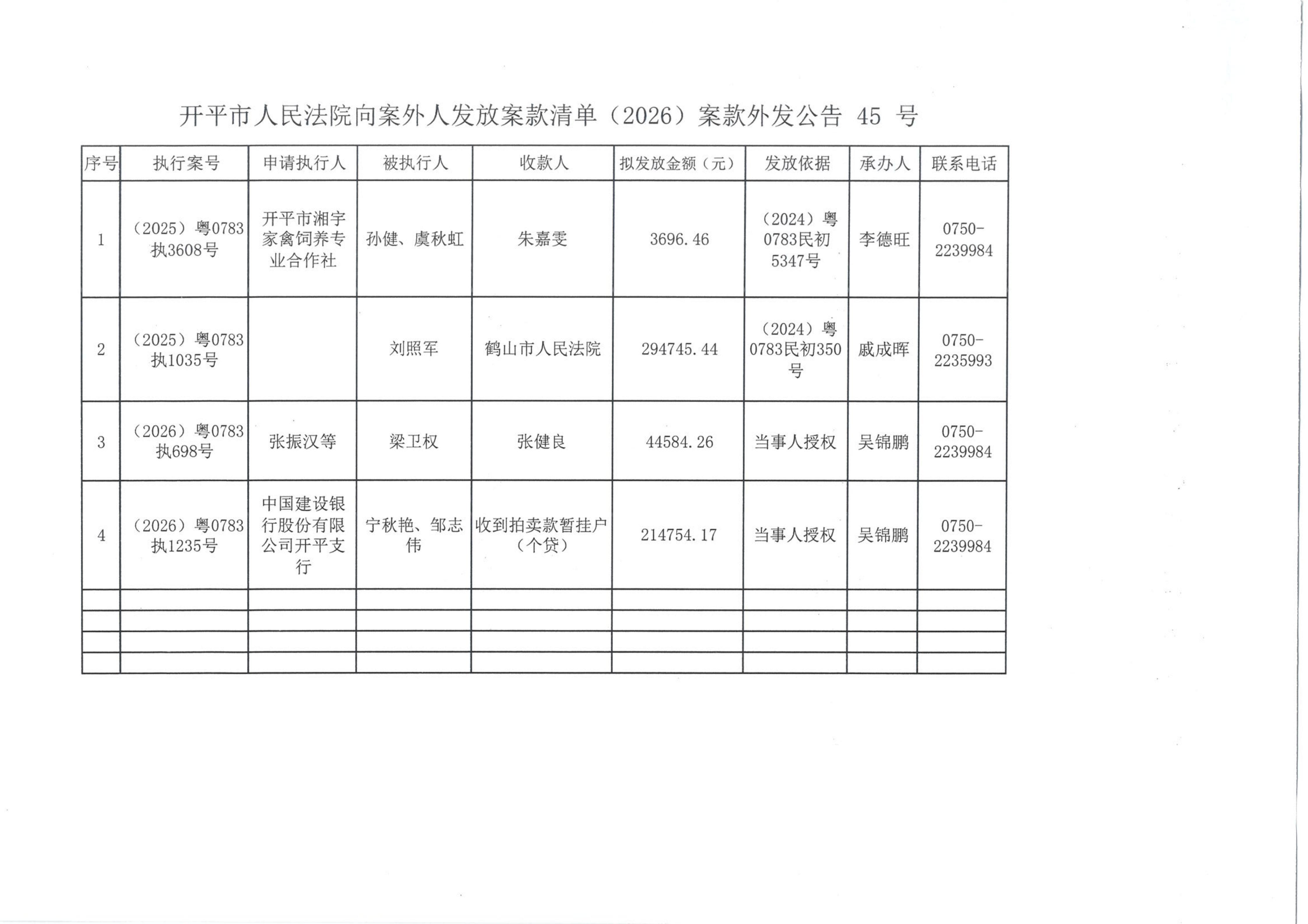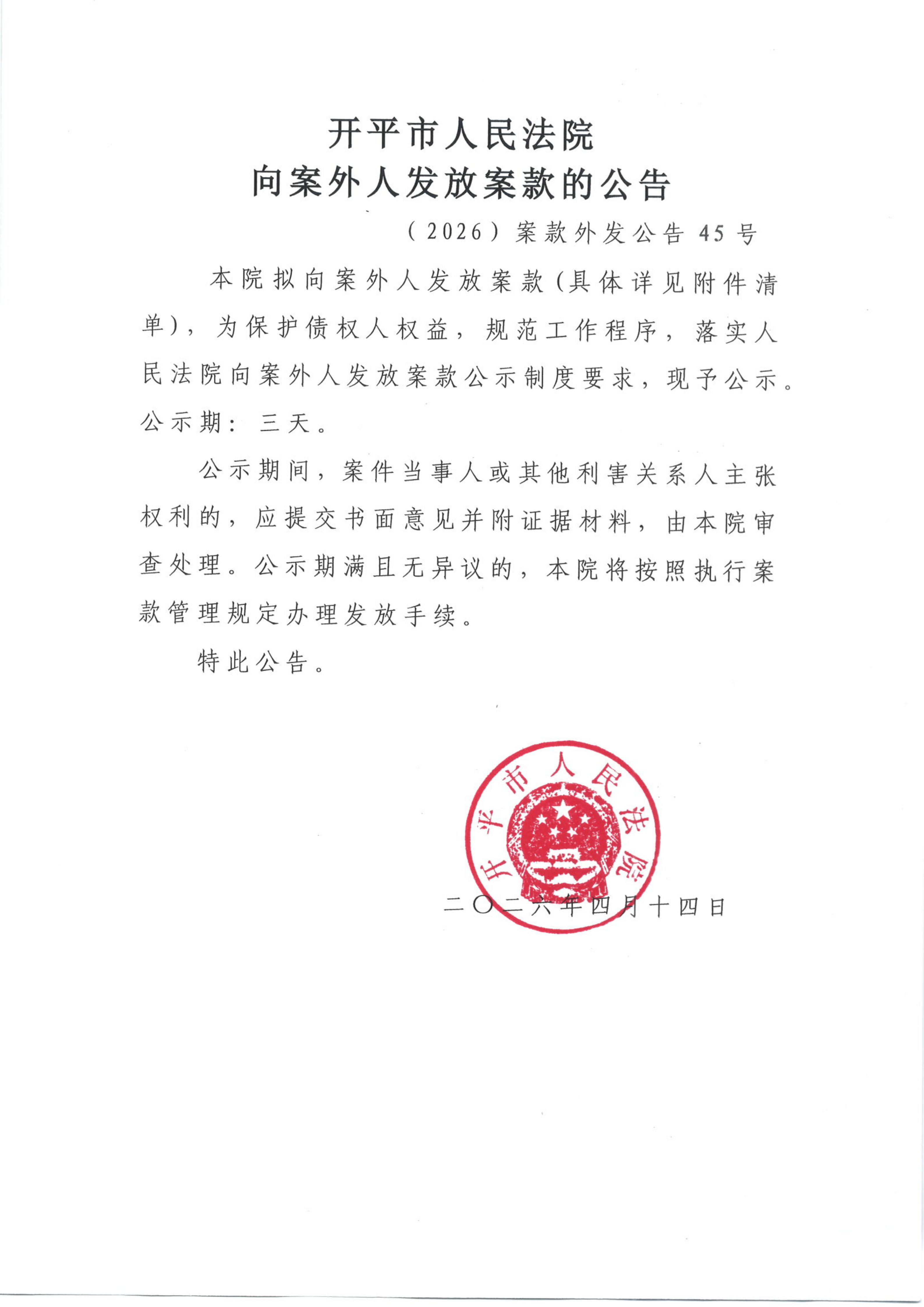 (2026)案款外发公告45号向案外人发放案款的公告