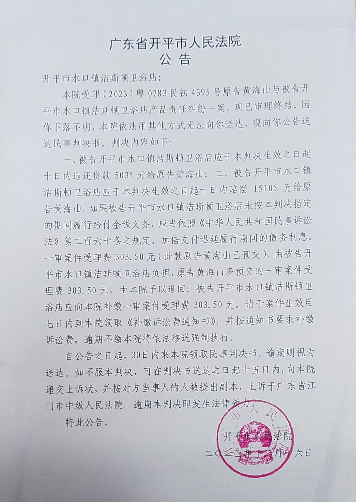 附件:(2023)粤0783民初4395号 开平市水口镇洁斯顿卫浴店 判决公告.pdf