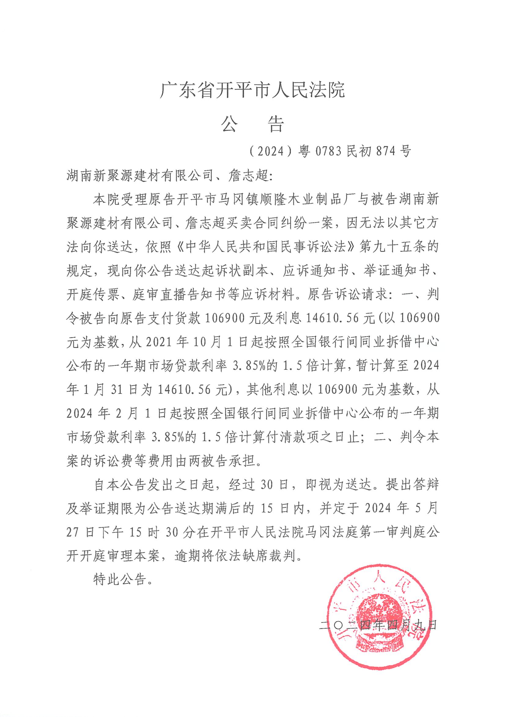 附件:(2024)粤0783民初874号 湖南新聚源建材有限公司、詹志超 开庭公告.pdf