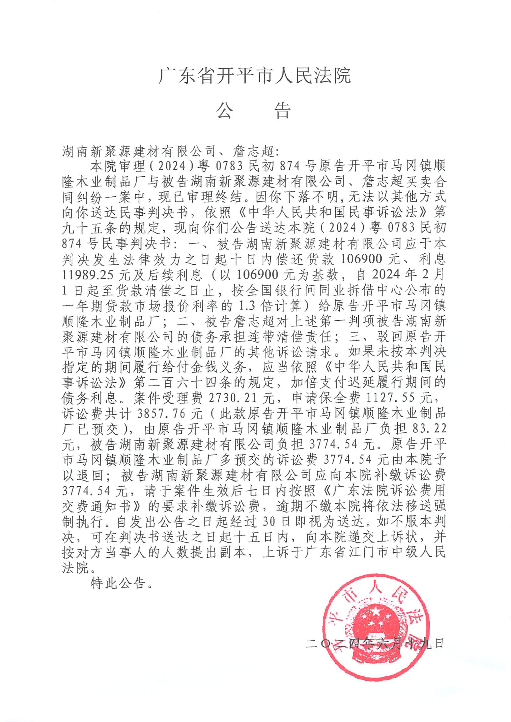 附件:(2024)粤0783民初874号 湖南新聚源建材有限公司、詹志超 判决公告.pdf