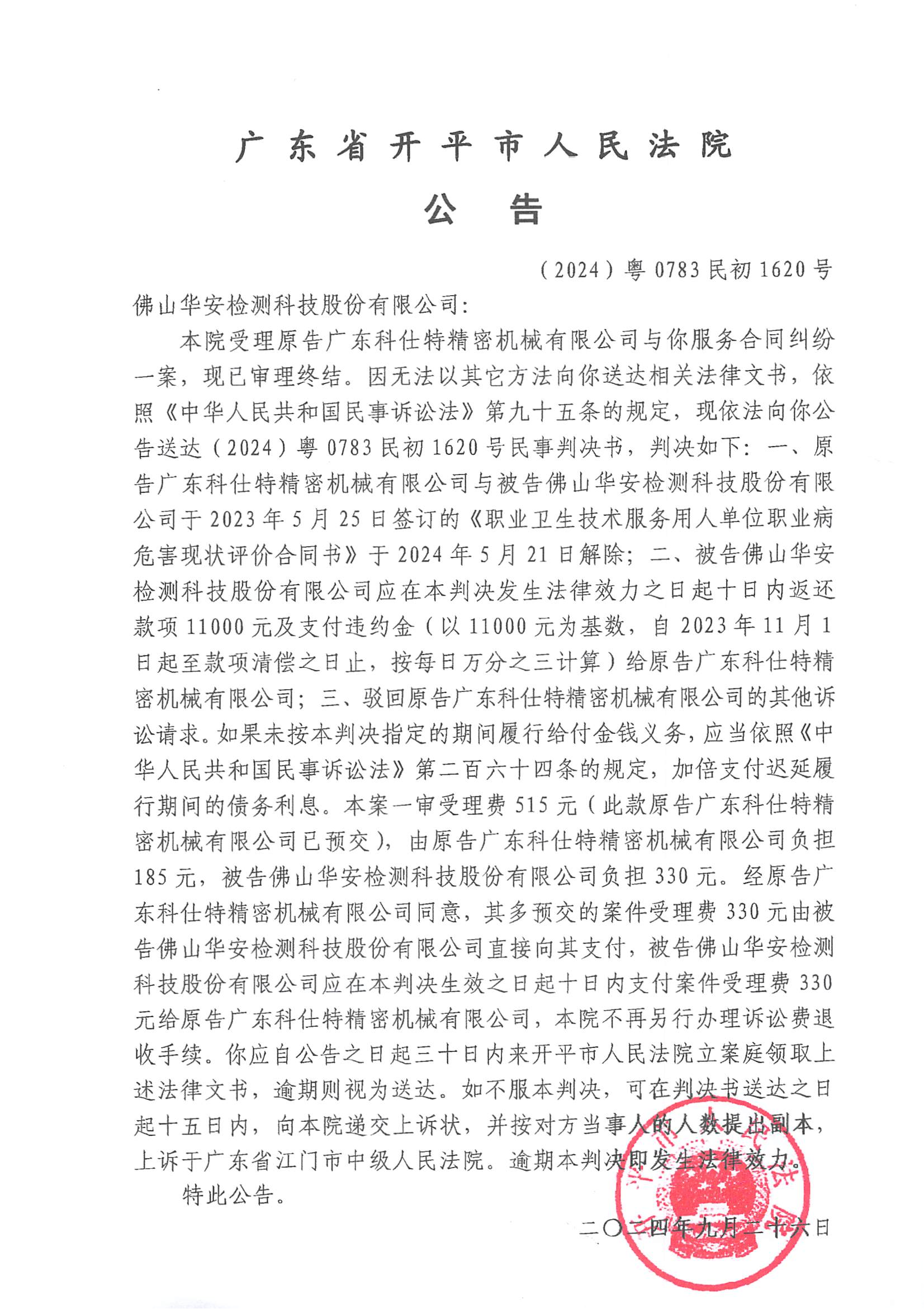 附件:(2024)粤0783民初1620号 佛山华安检测科技股份有限公司 判决公告.pdf