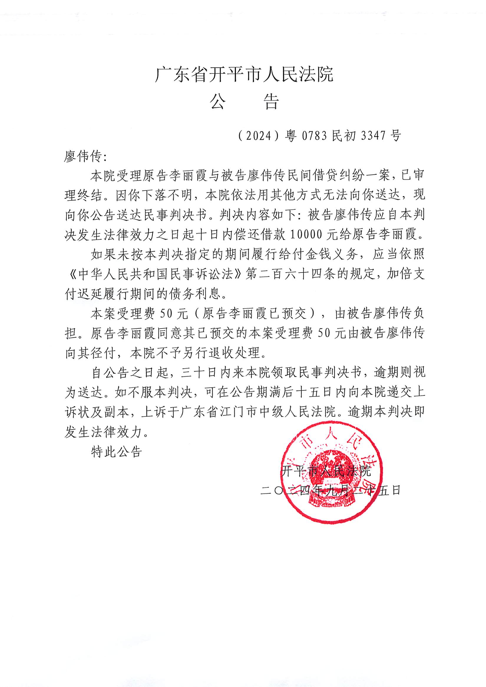 附件:(2024)粤0783民初3347号 廖伟传 判决公告.pdf