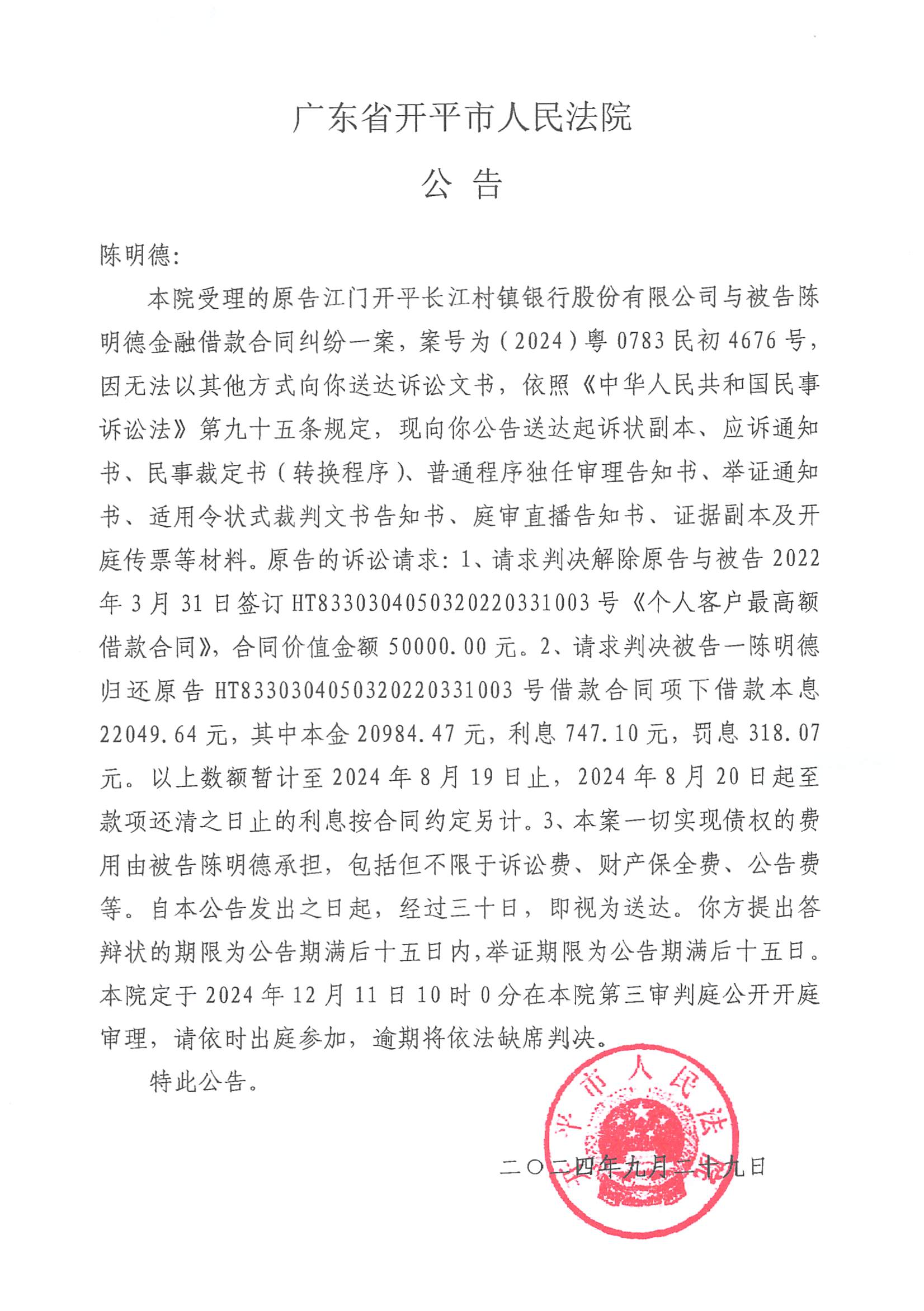 附件:(2024)粤0783民初4676号 陈明德 开庭公告.pdf