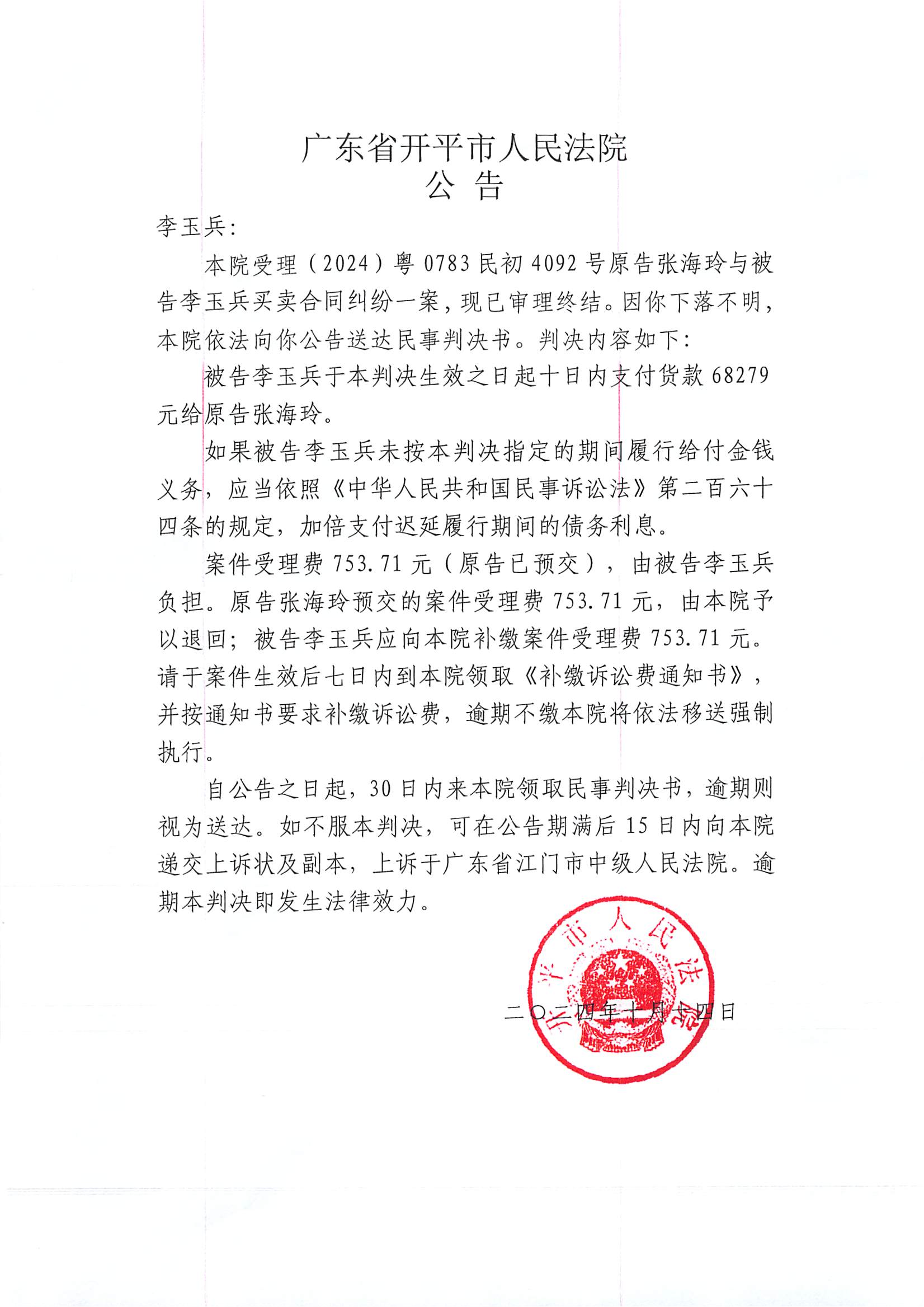 附件:(2024)粤0783民初4092号 李玉兵 判决公告.pdf