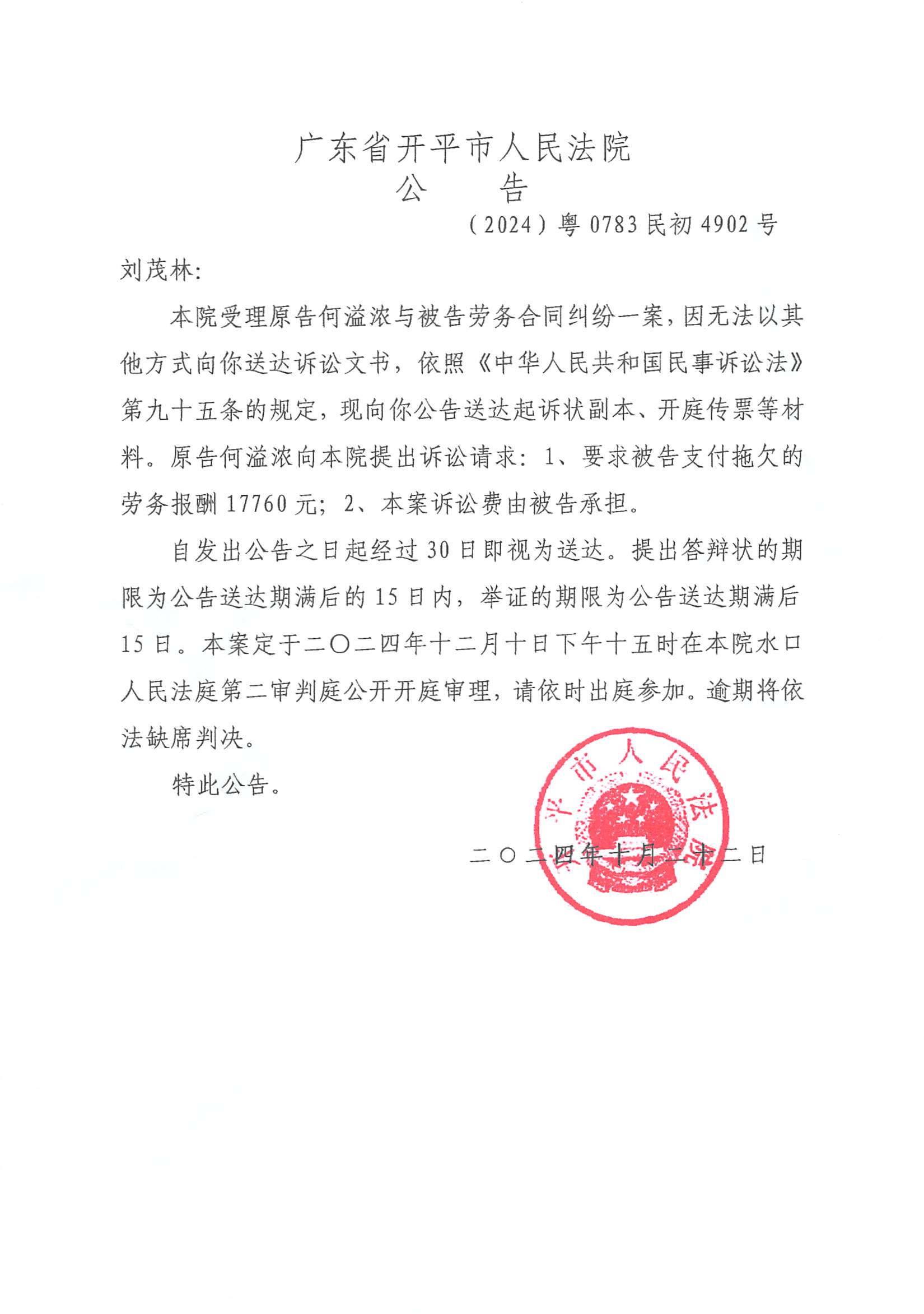 附件:(2024)粤0783民初4902号 刘茂林 开庭公告.pdf