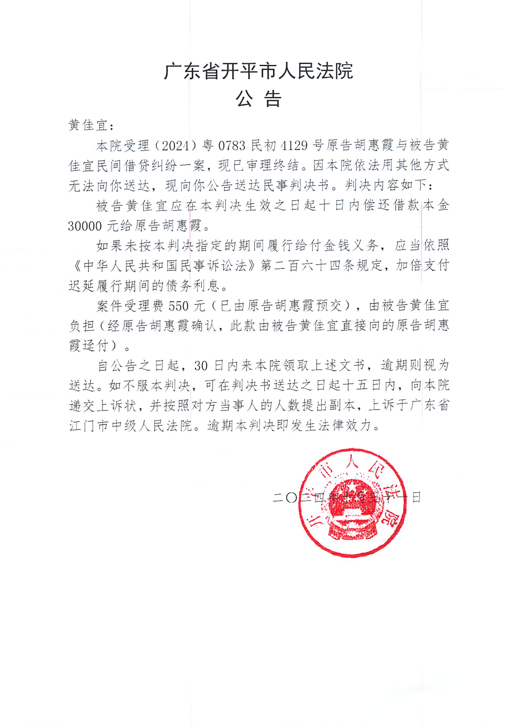 附件:(2024)粤0783民初4129号 黄佳宜 判决公告.pdf