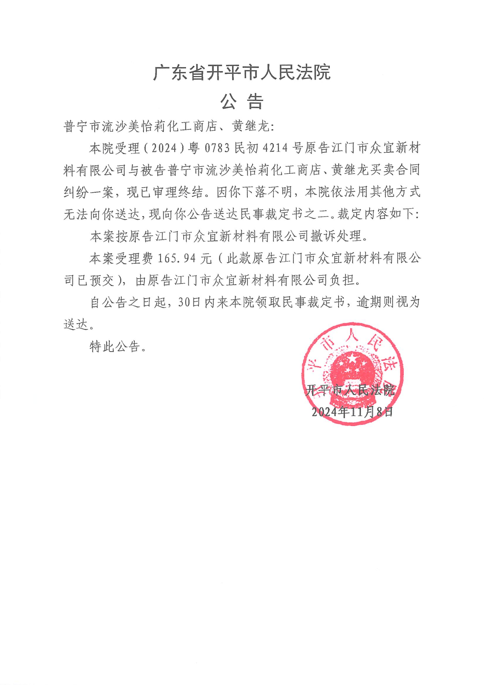 附件:(2024)粤0783民初4214号 普宁市流沙美怡莉化工商店、黄继龙 裁定公告.pdf