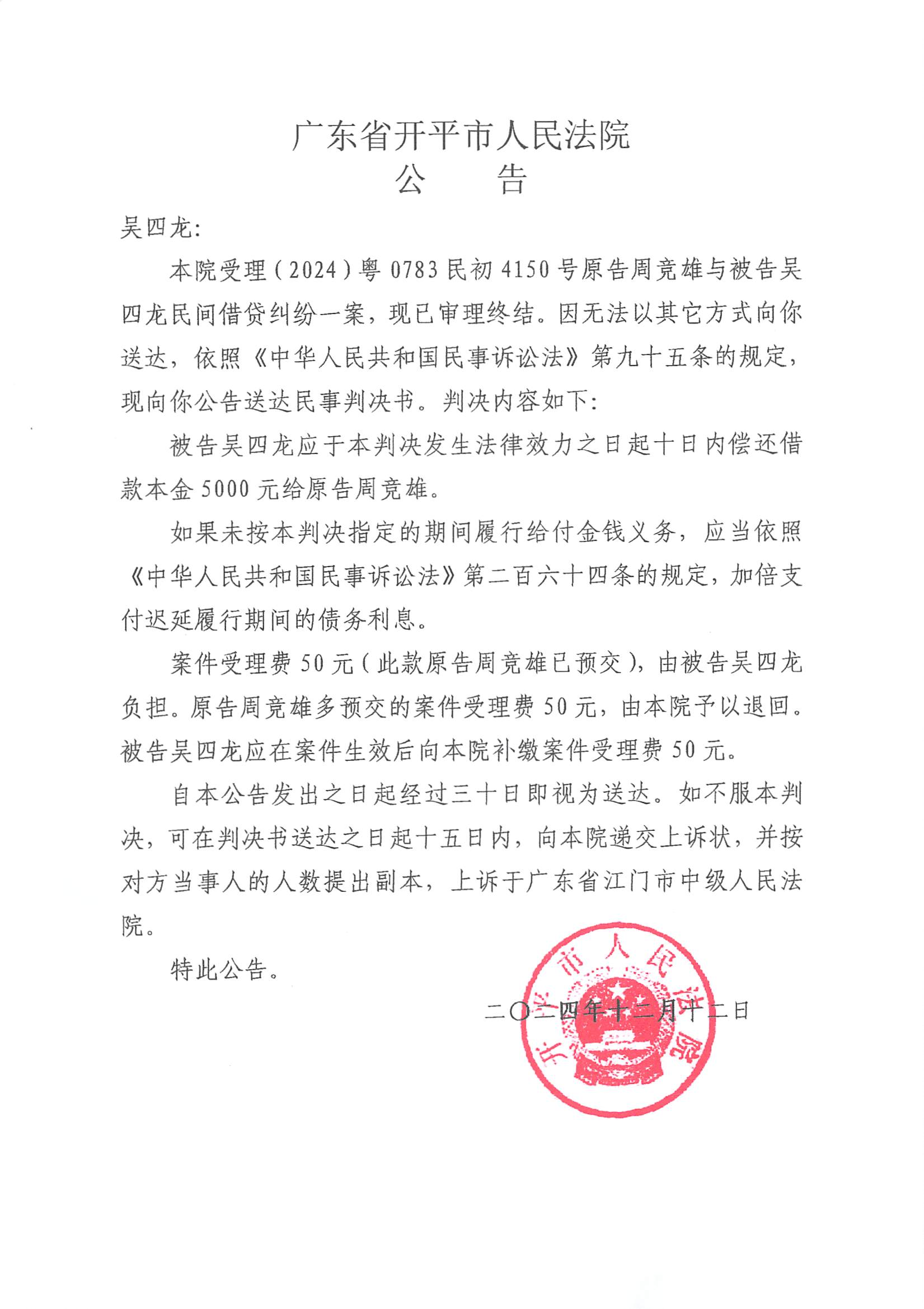 附件:(2024)粤0783民初4150号 吴四龙 判决公告.pdf