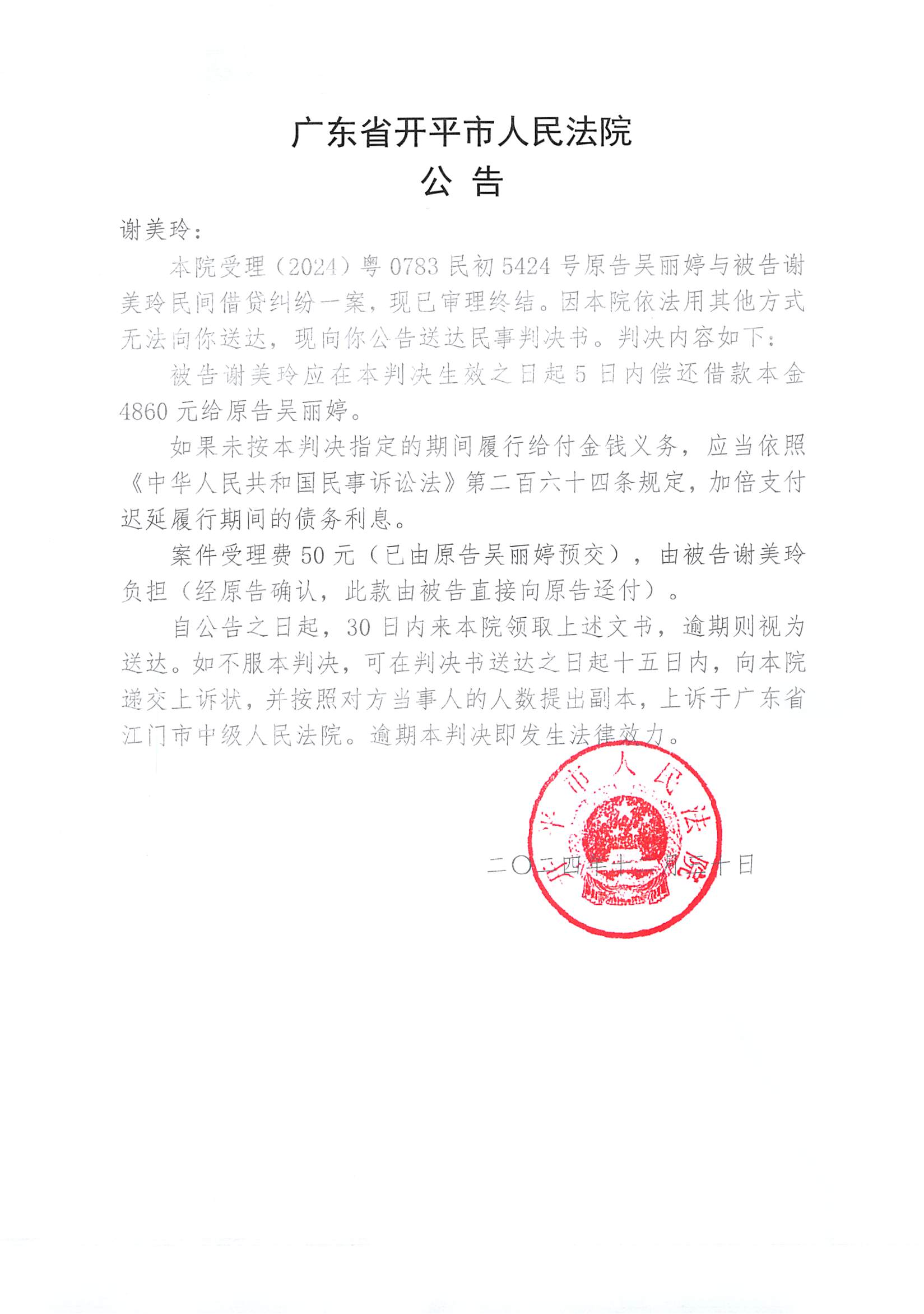 附件:(2024)粤0783民初5424号 谢美玲 判决公告.pdf