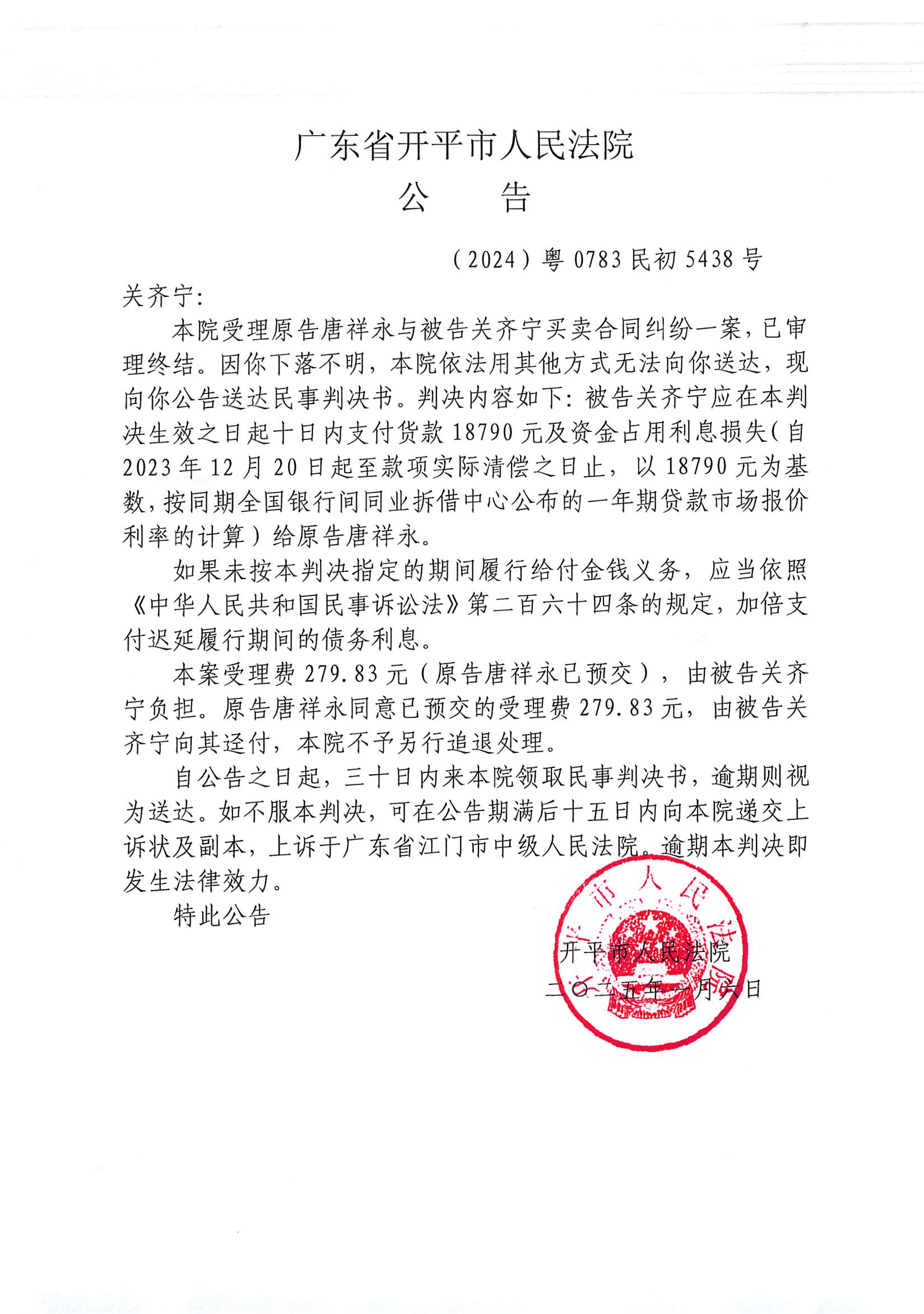 附件:(2024)粤0783民初5438号 关齐宁 判决公告.pdf