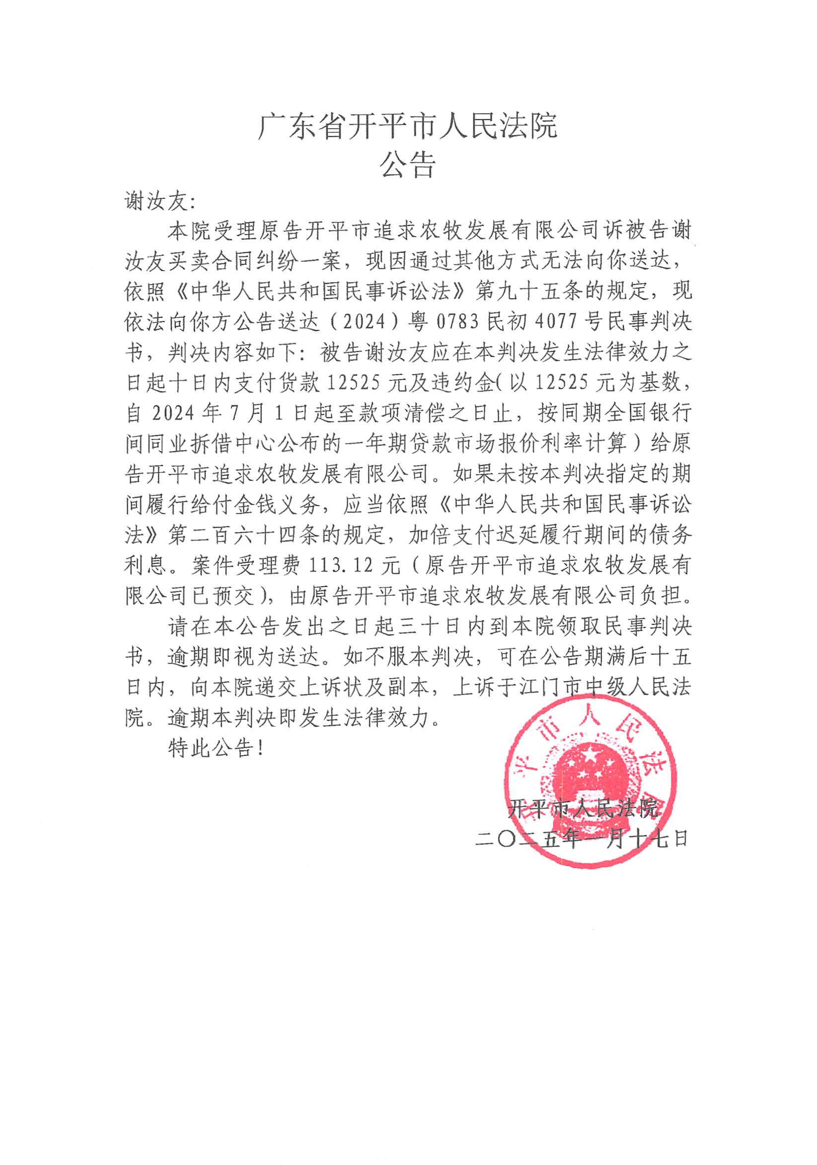 附件:(2024)粤0783民初4077号 谢汝友 判决公告.pdf