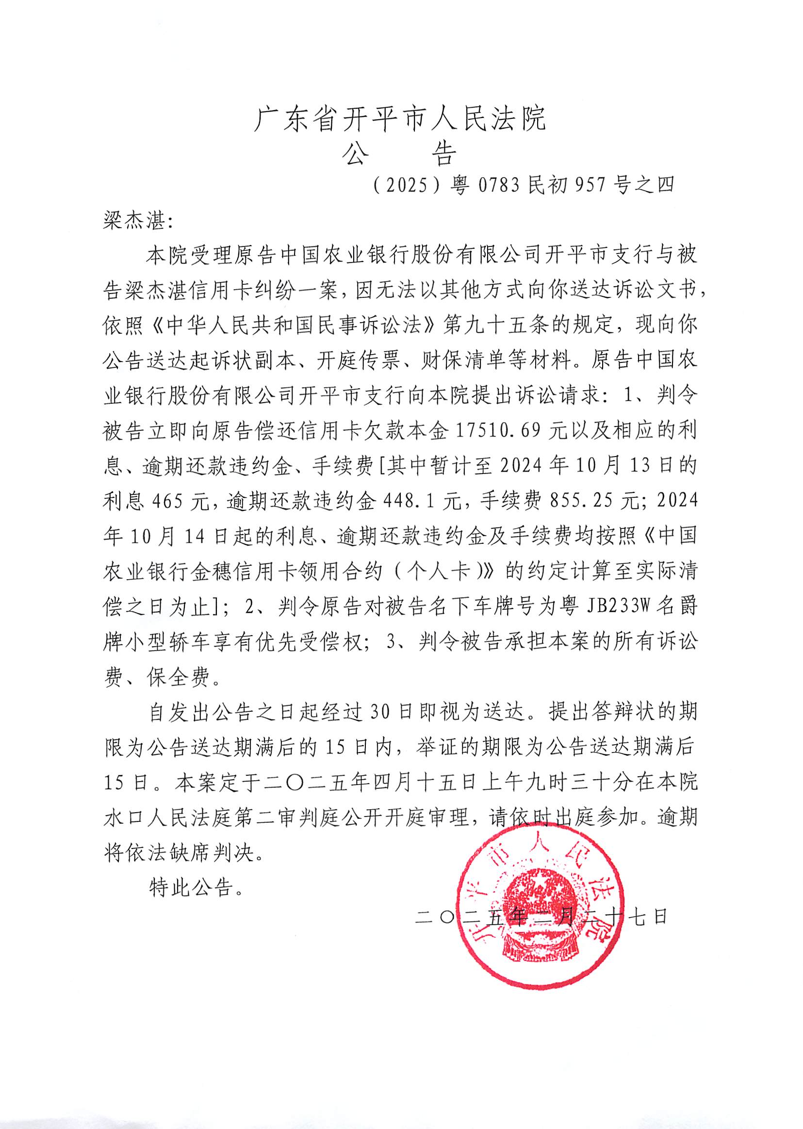 附件:(2025)粤0783民初957号之四 梁杰湛 开庭公告.pdf