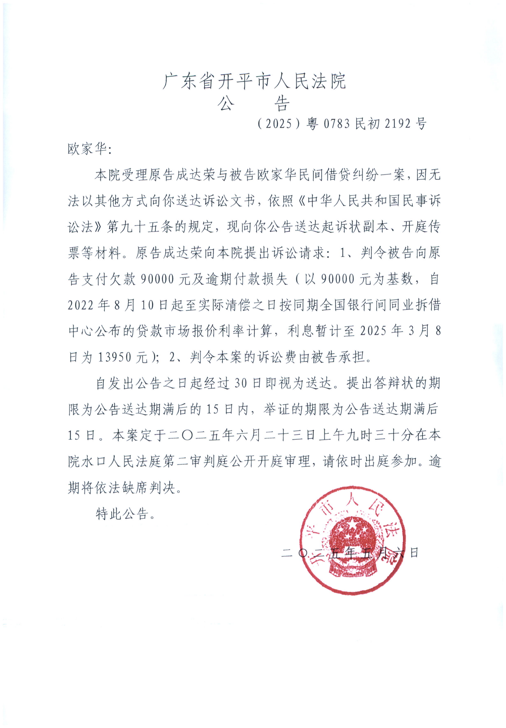 附件:(2025)粤0783民初2192号 欧家华 开庭公告.pdf