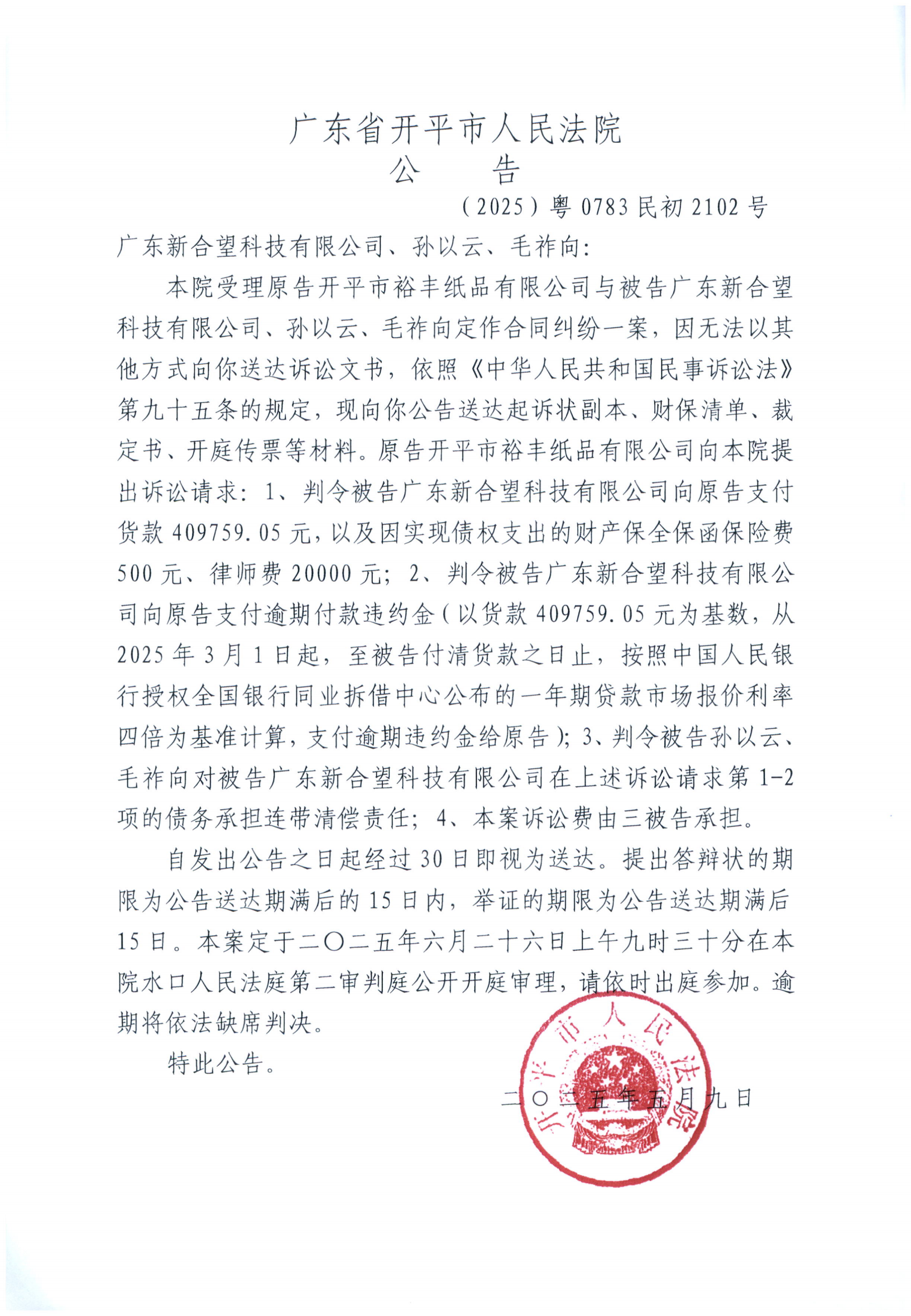 附件:(2025)粤0783民初2102号 广东新合望科技有限公司、孙以云、毛祚向 开庭公告.pdf
