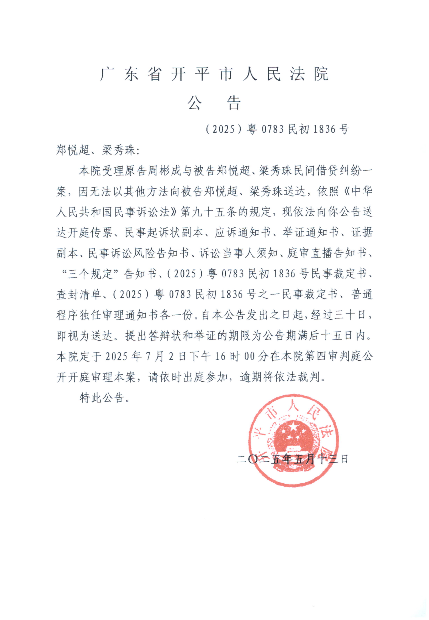 附件:(2025)粤0783民初1836号 郑悦超、梁秀珠 开庭公告.pdf