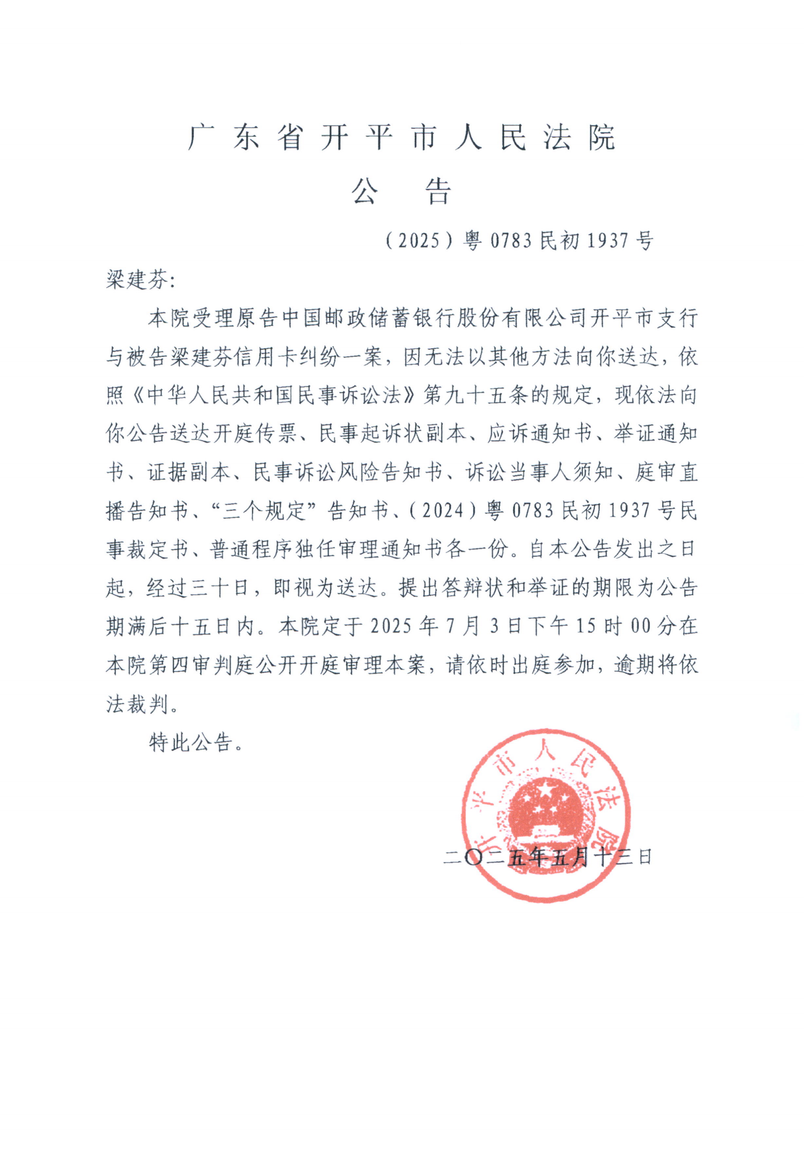 附件:(2025)粤0783民初1937号 梁建芬 开庭公告.pdf