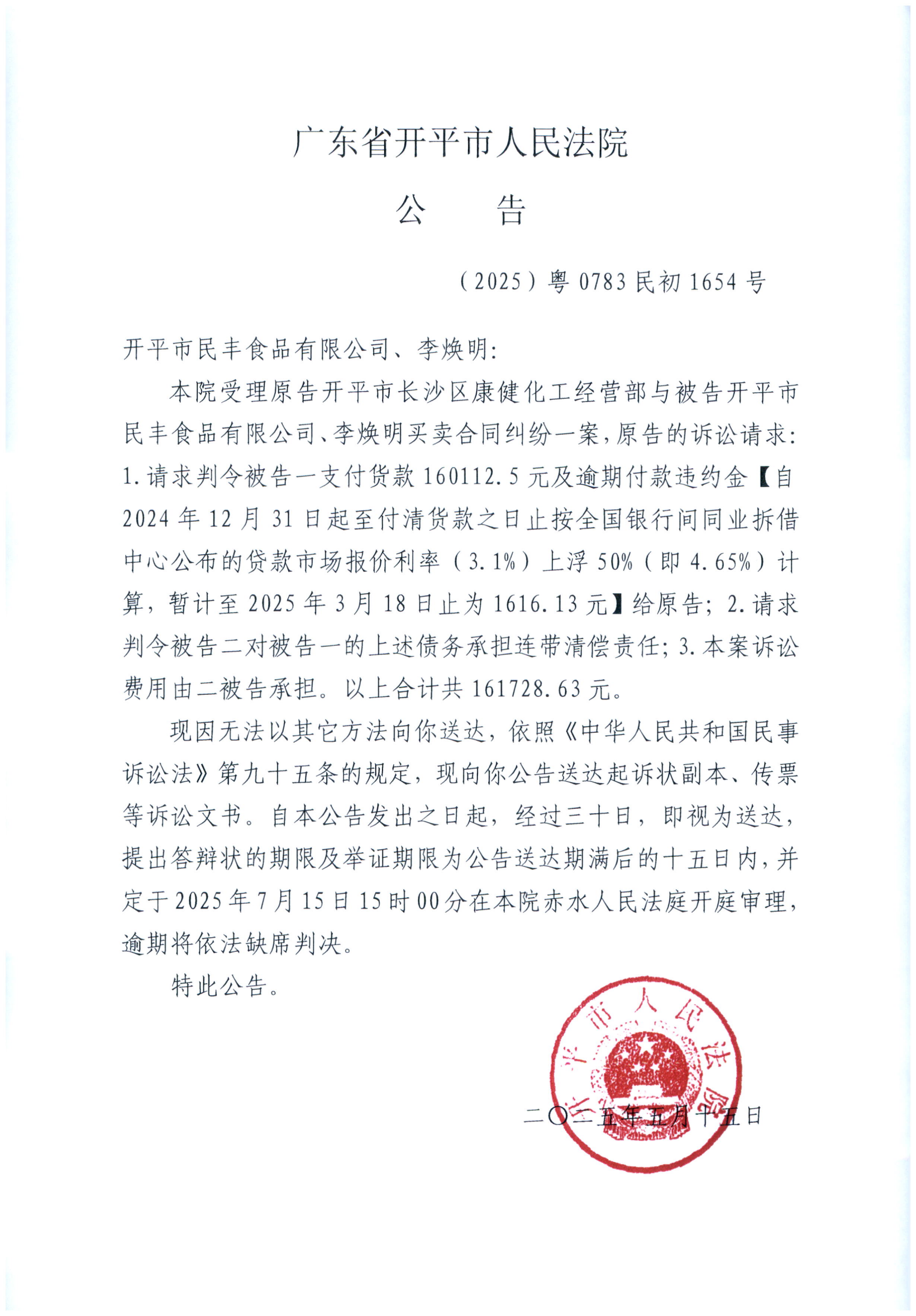 附件:(2025)粤0783民初1654号 开平市民丰食品有限公司、李焕明 开庭公告.pdf