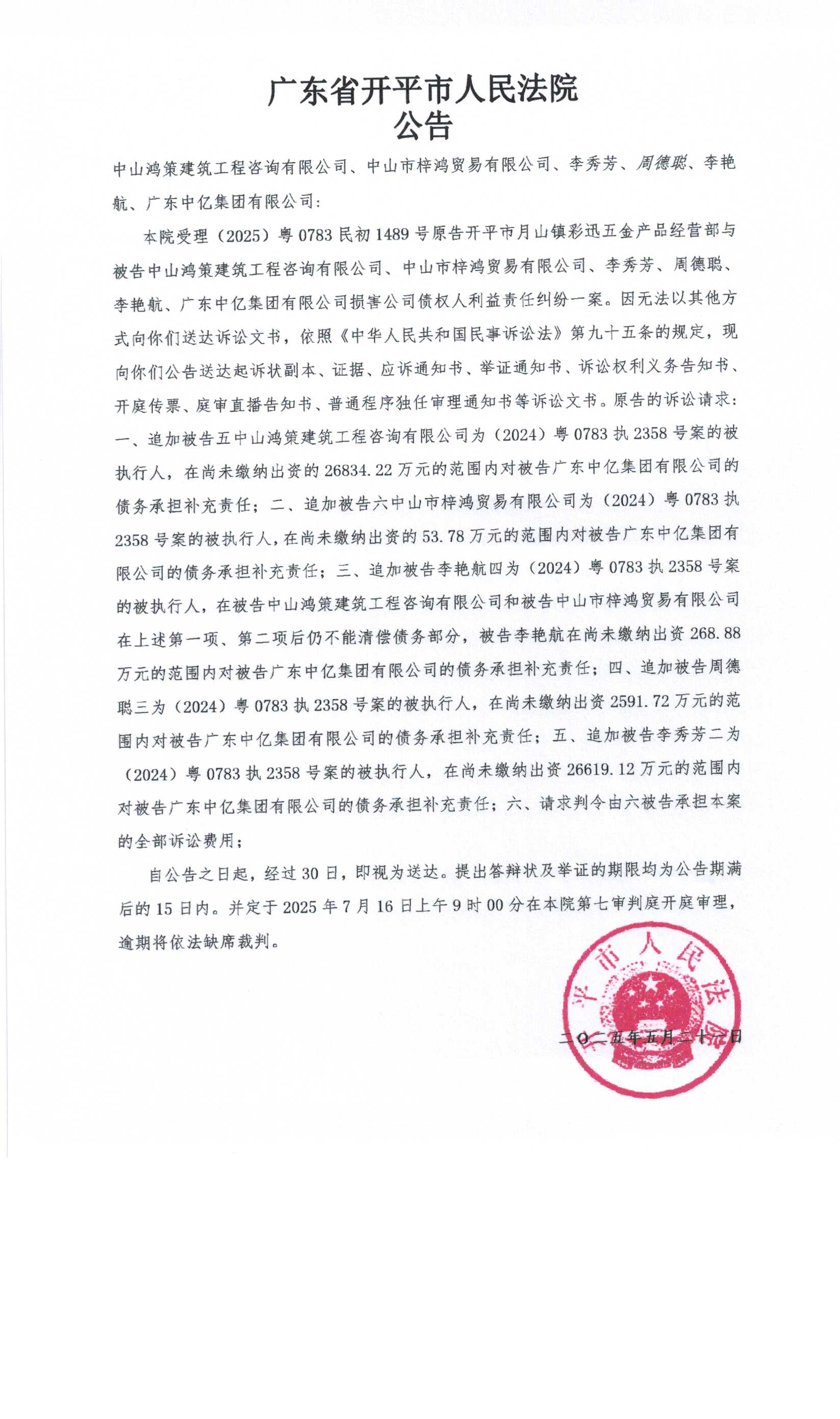 1489中山鸿策建筑工程咨询有限公司、中山市梓鸿贸易有限公司、李秀芳、周德聪、李艳航、广东中亿集团有限公司公告(已签章版).pdf