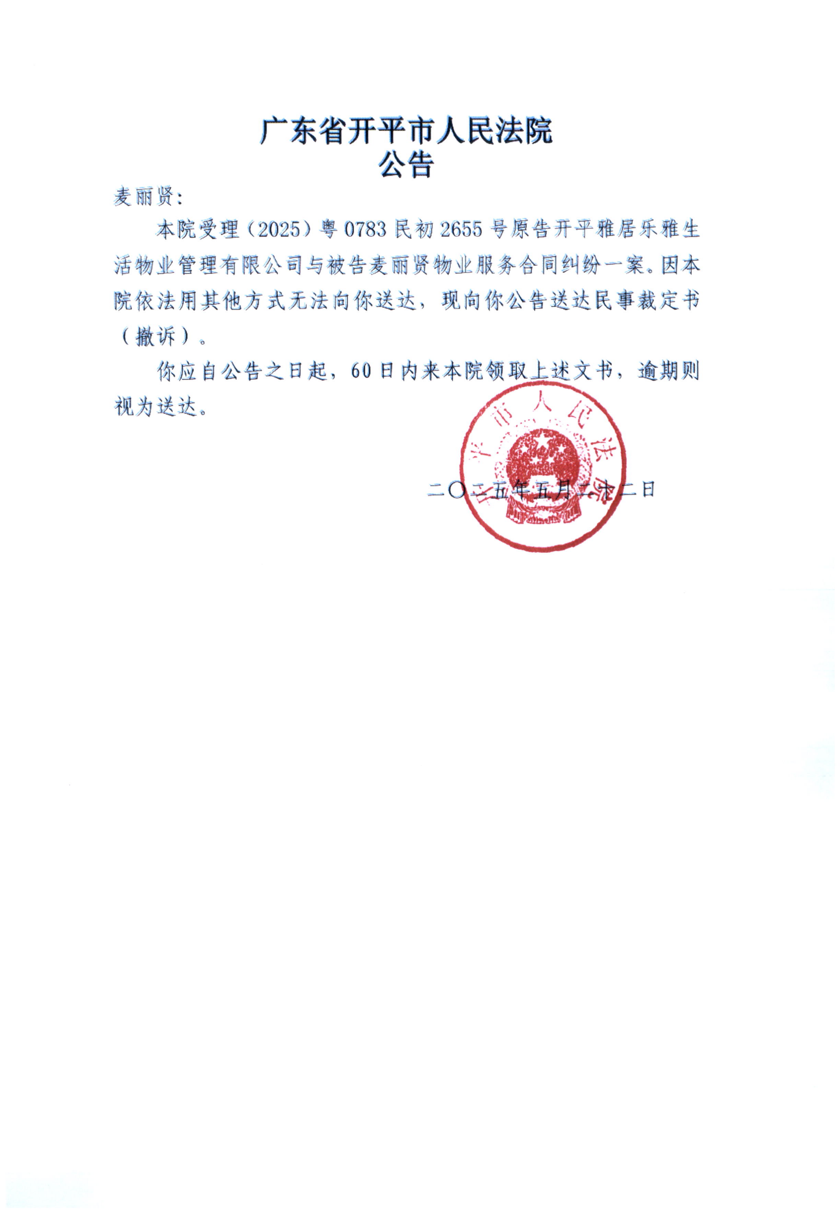 附件:(2025)粤0783民初2655号 麦丽贤 裁定公告.pdf