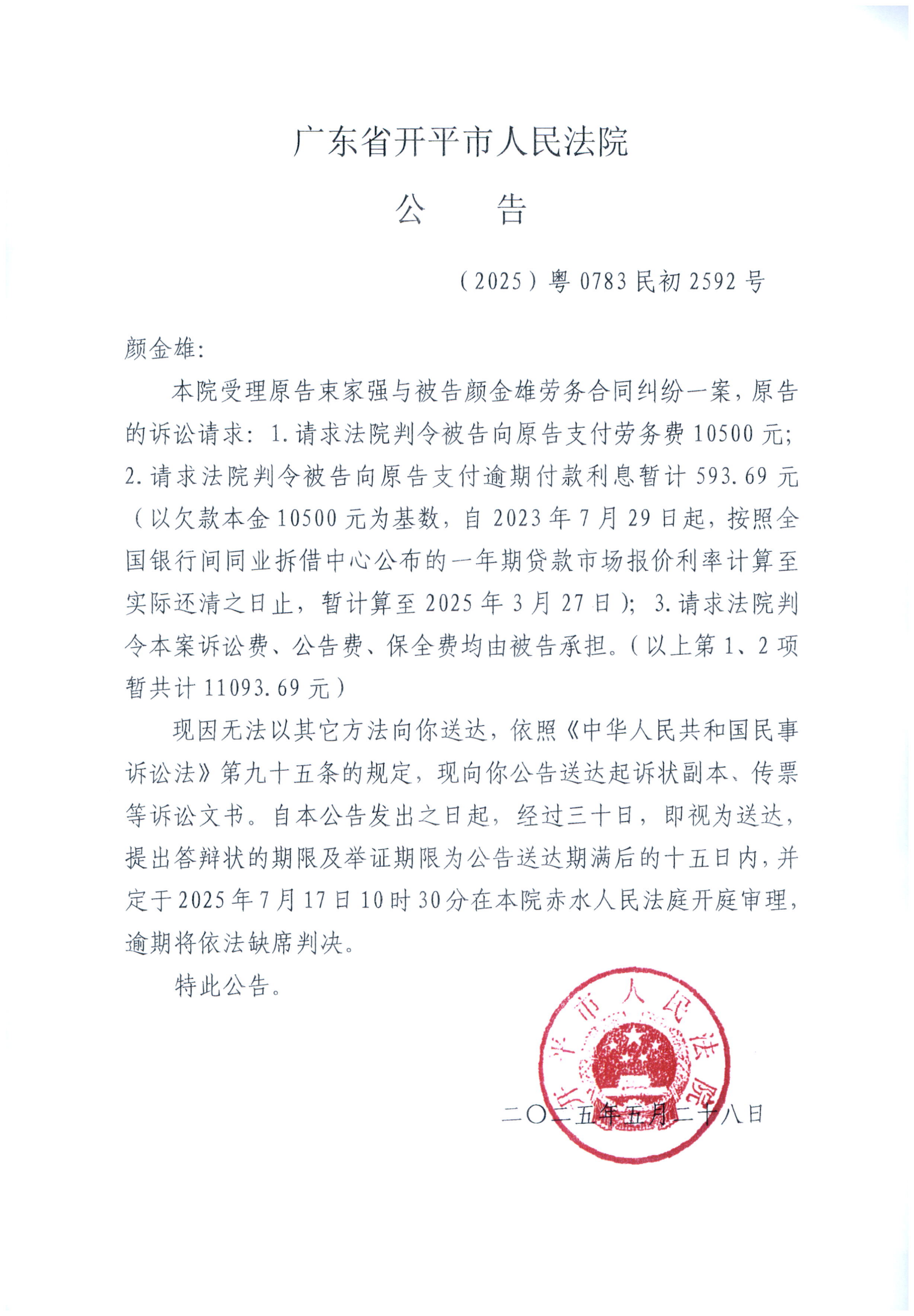 (2025)粤0783民初2592号 颜金雄 开庭公告