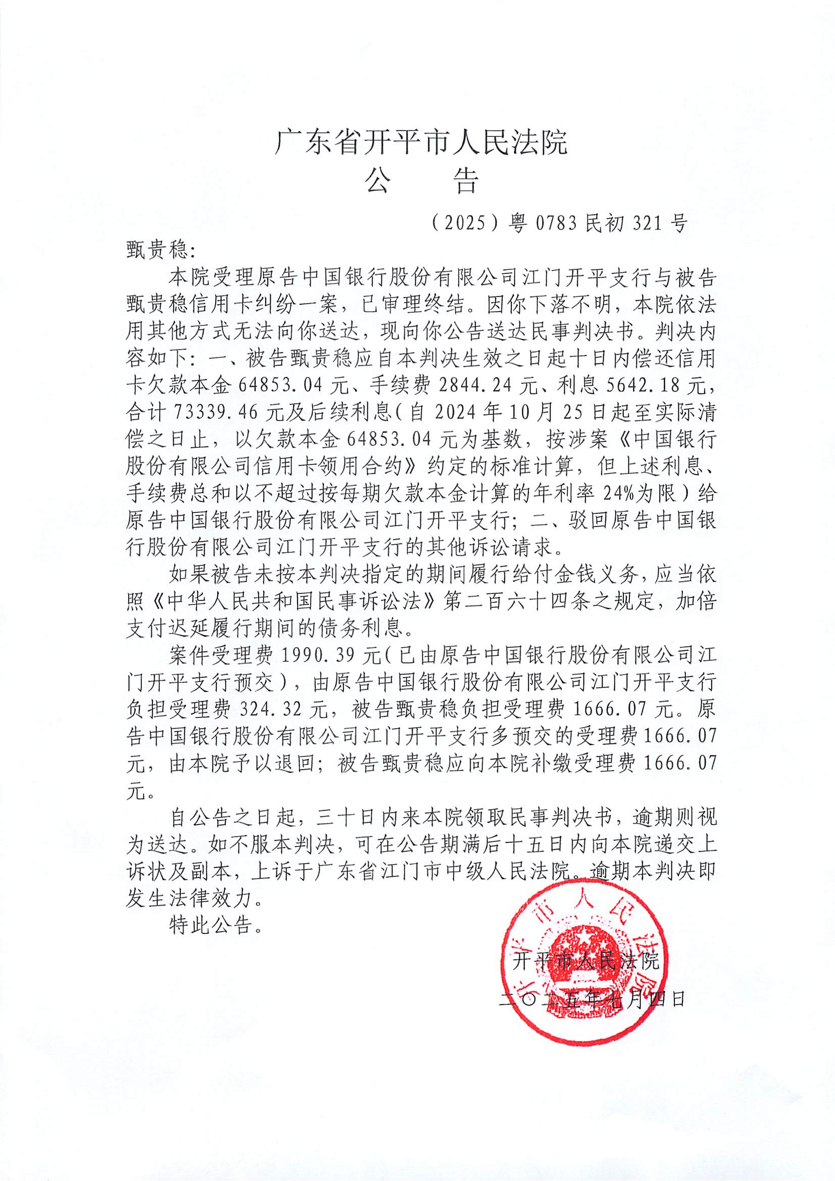 附件:(2025)粤0783民初321号 甄贵稳 判决公告.pdf