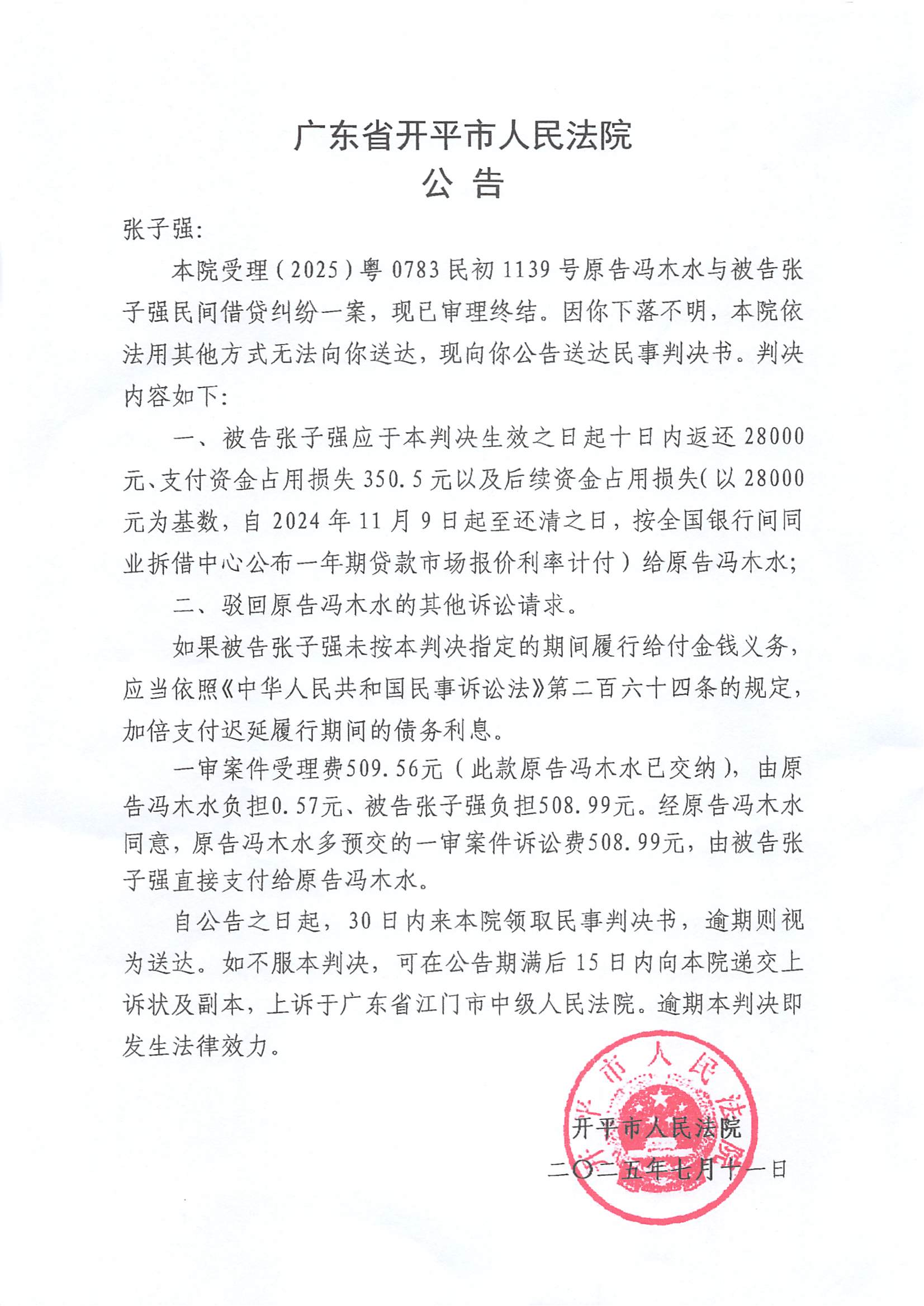 附件:(2025)粤0783民初1139号 张子强 判决公告.pdf