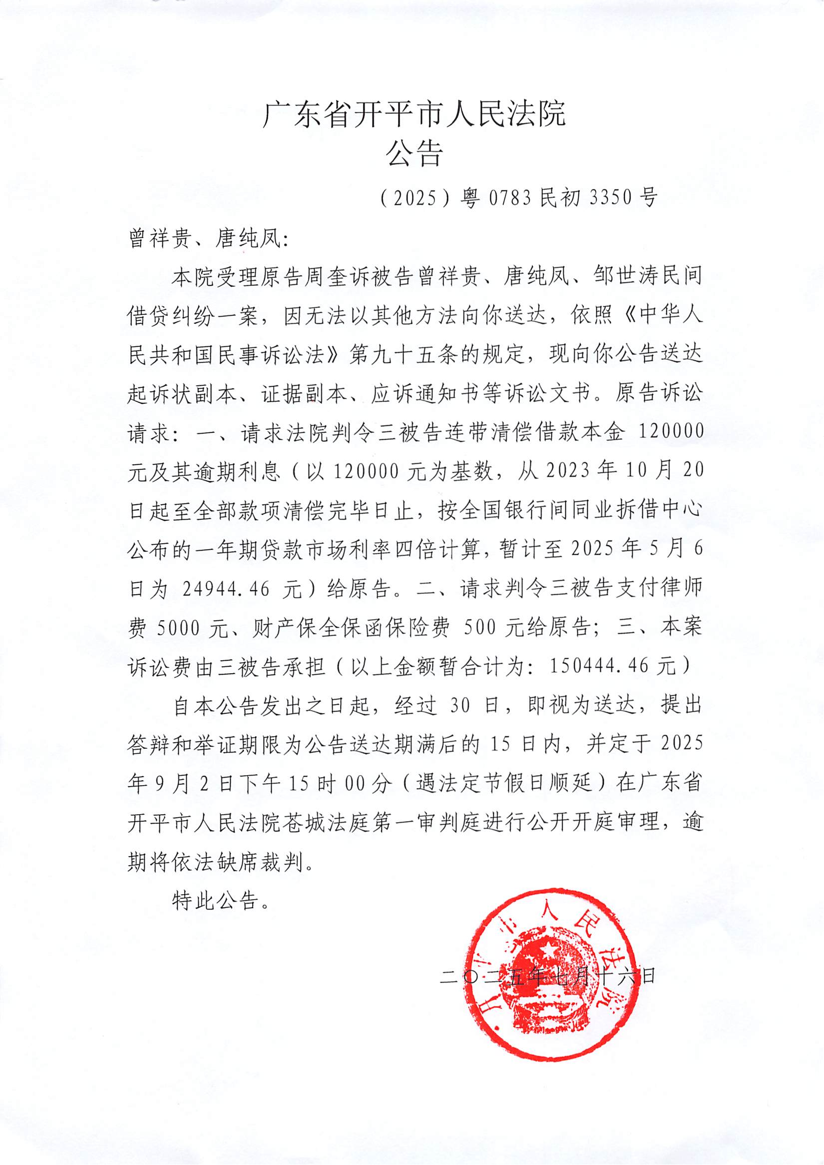 附件:(2025)粤0783民初3350号 曾祥贵、唐纯凤 开庭公告.pdf