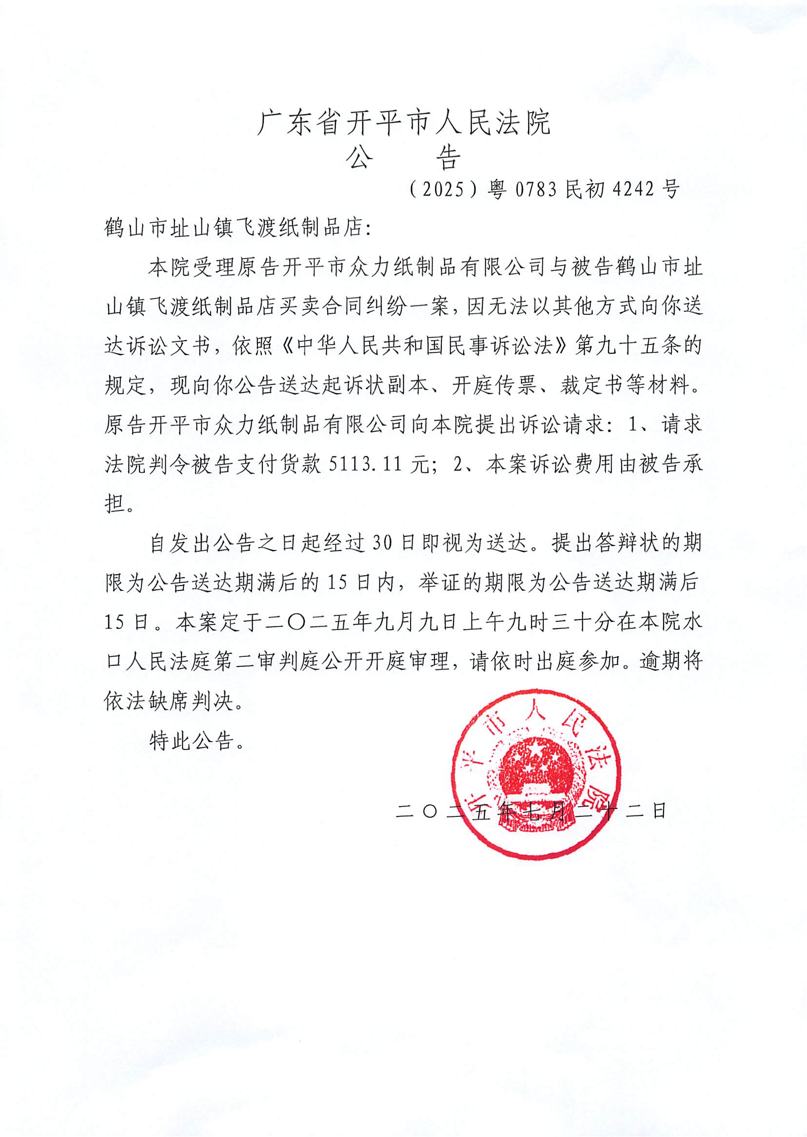 附件:(2025)粤0783民初4242号 鹤山市址山镇飞渡纸制品店 开庭公告.pdf