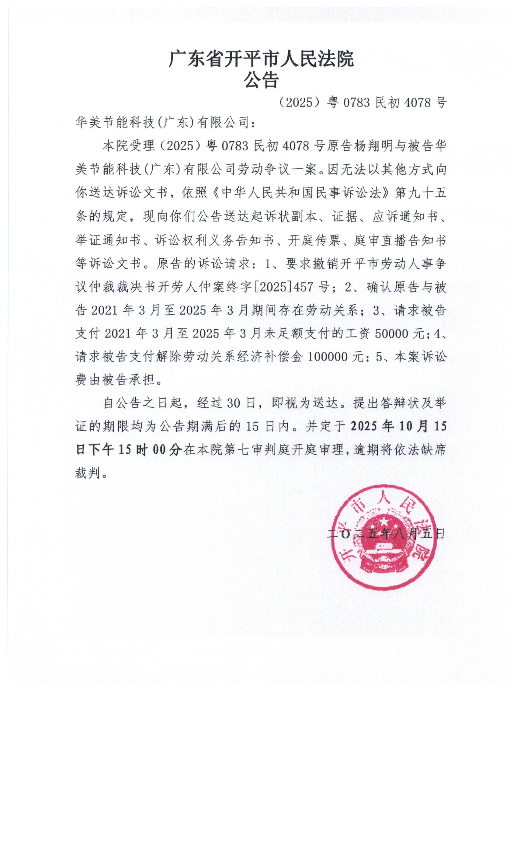 (2025)粤0783民初4078号华美节能科技(广东)有限公司劳动争议应诉公告_1(已签章版).pdf