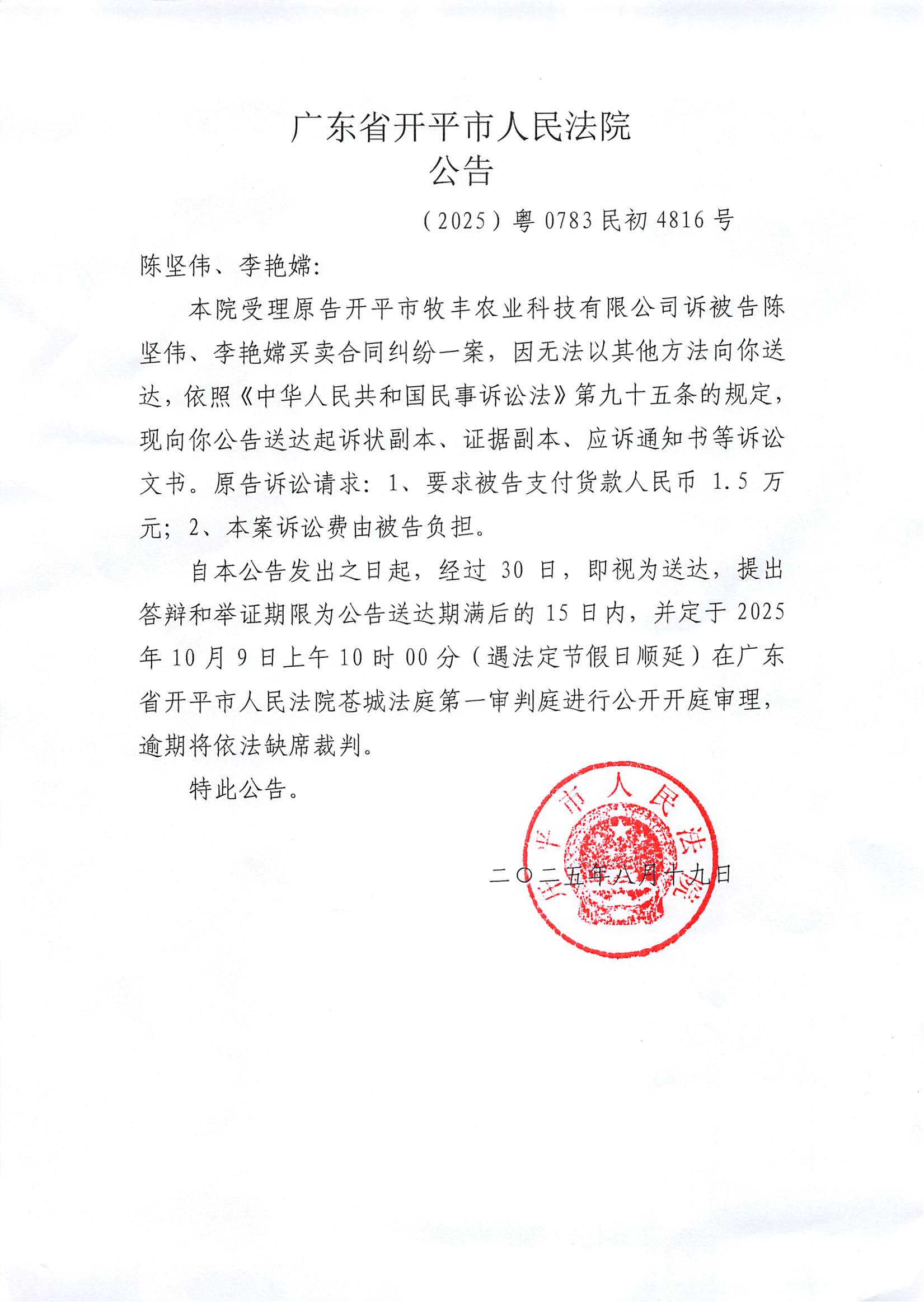 附件:(2025)粤0783民初4816号 陈坚伟、李艳嫦 开庭公告.pdf