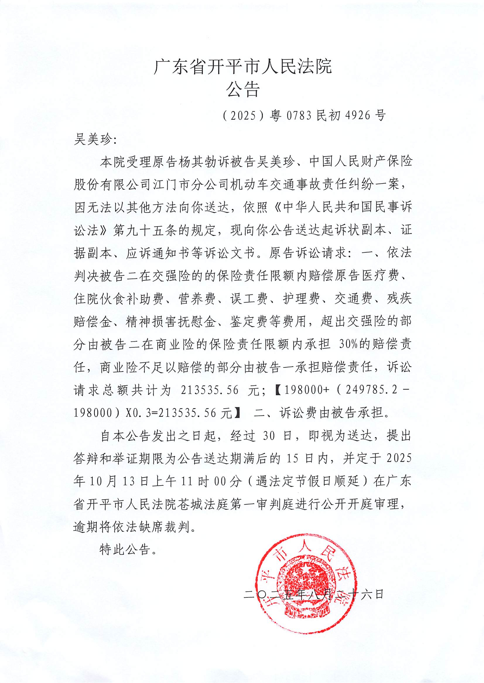 附件:(2025)粤0783民初4926号 吴美珍 开庭公告.pdf