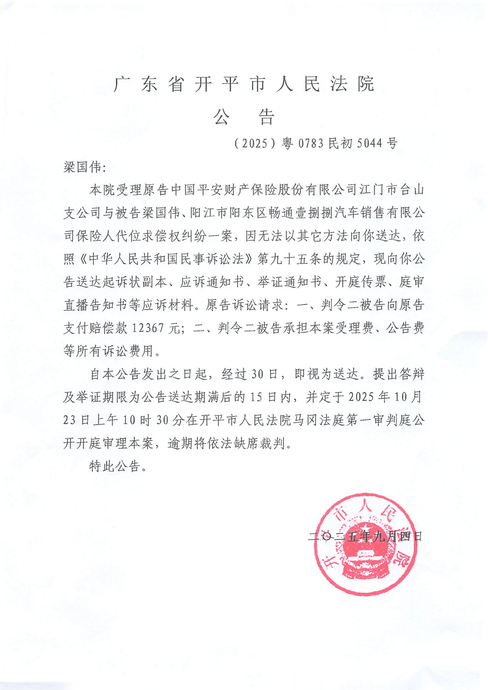附件:(2025)粤0783民初5044号 梁国伟 开庭公告.pdf