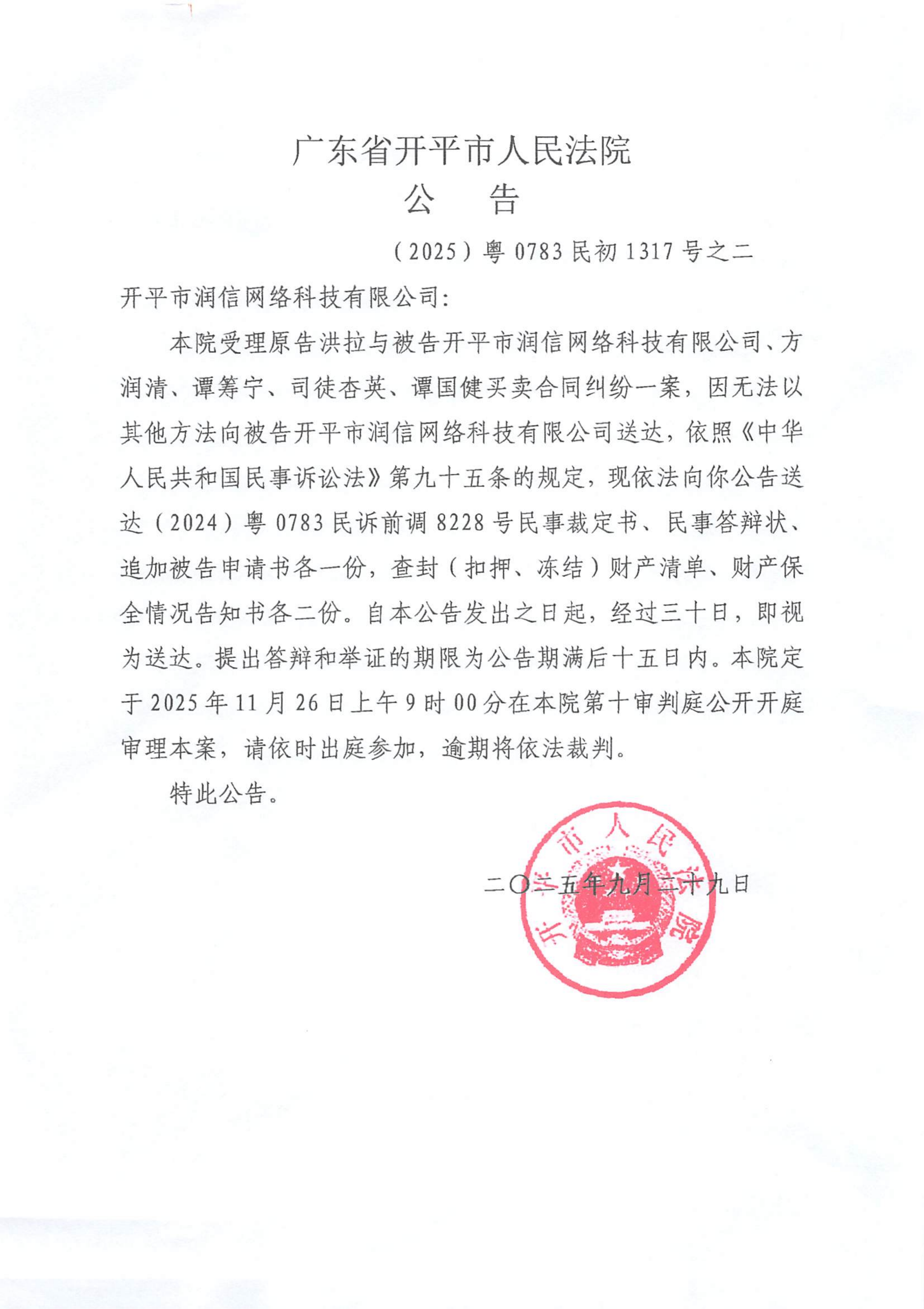 附件:(2025)粤0783民初1317号之二 开平市润信网络科技有限公司 开庭公告.pdf